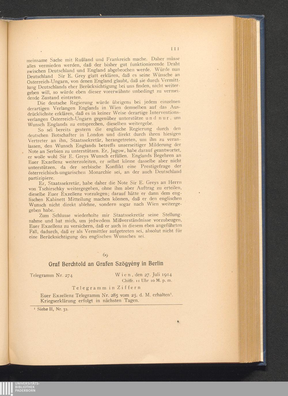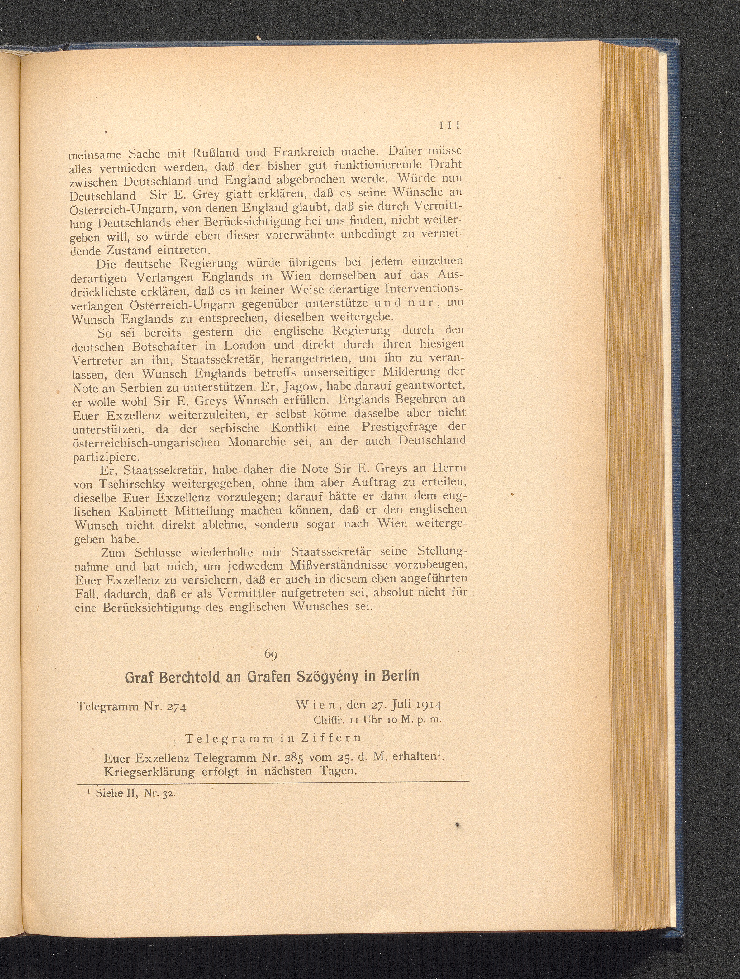 69. Wien, den 27. Juli 1914. Graf Berchtold an Grafen Szögyény in Berlin.