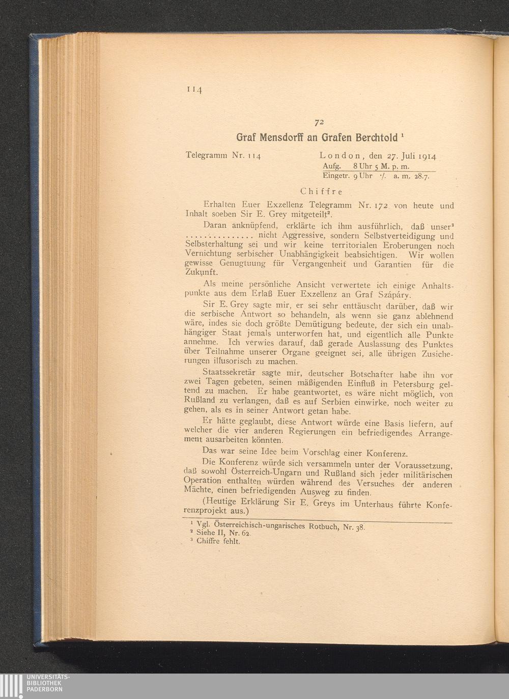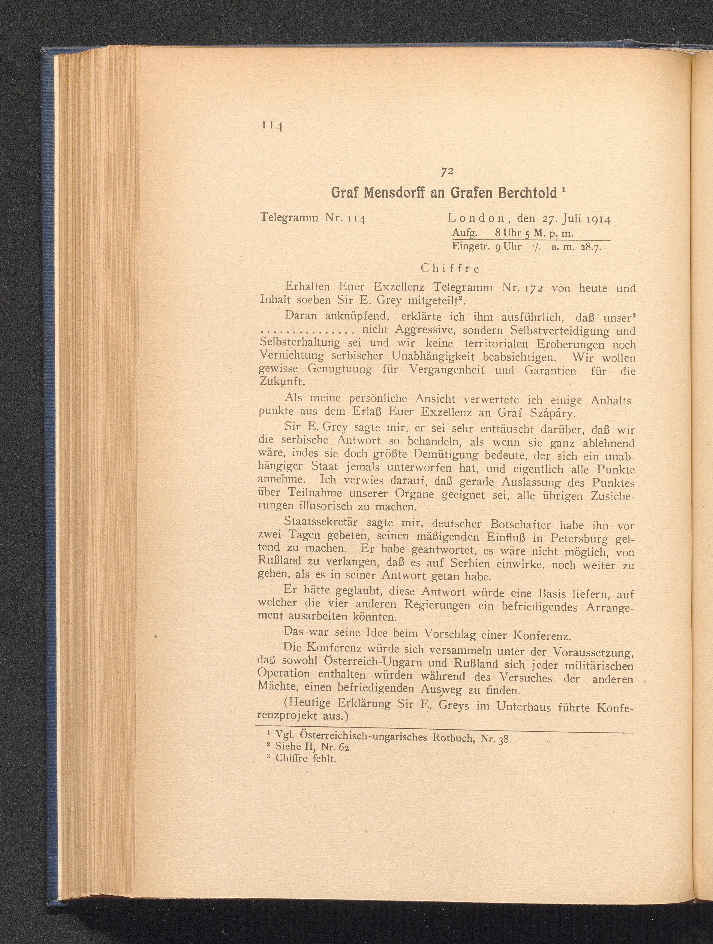 72. London, den 27. Juli 1914. Graf Mensdorff an Grafen Berchtold.