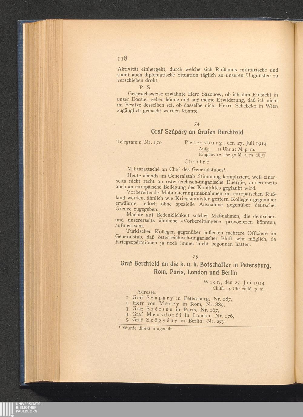 75. Wien, den 26. Juli 1914. Graf Berchtold an die k. u. k. Botschafter in Petersburg,[...]