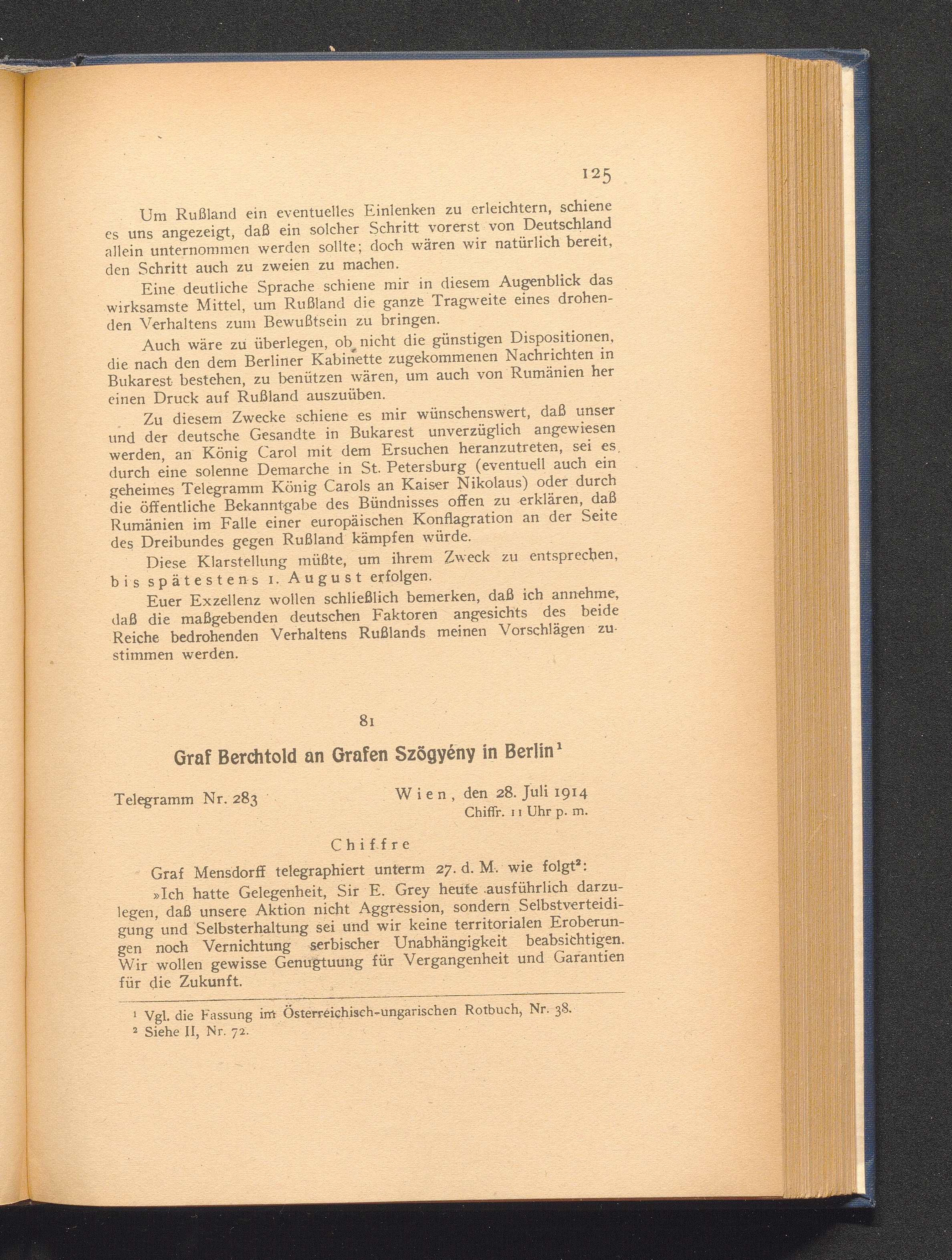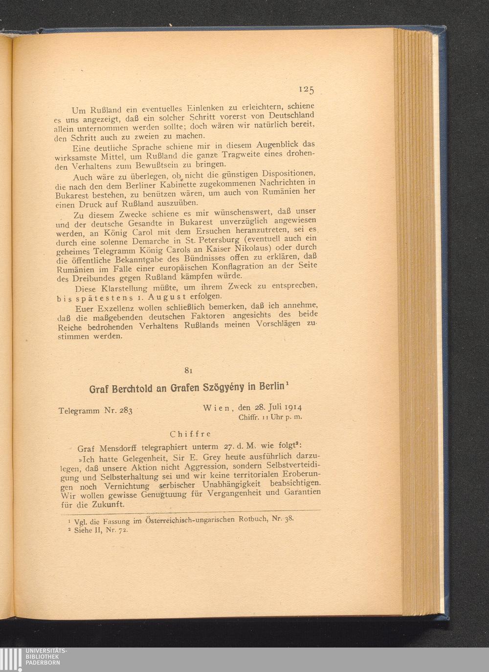 81. Wien, den 28. Juli 1914. Graf Berchtold an Grafen Szögyény in Berlin.
