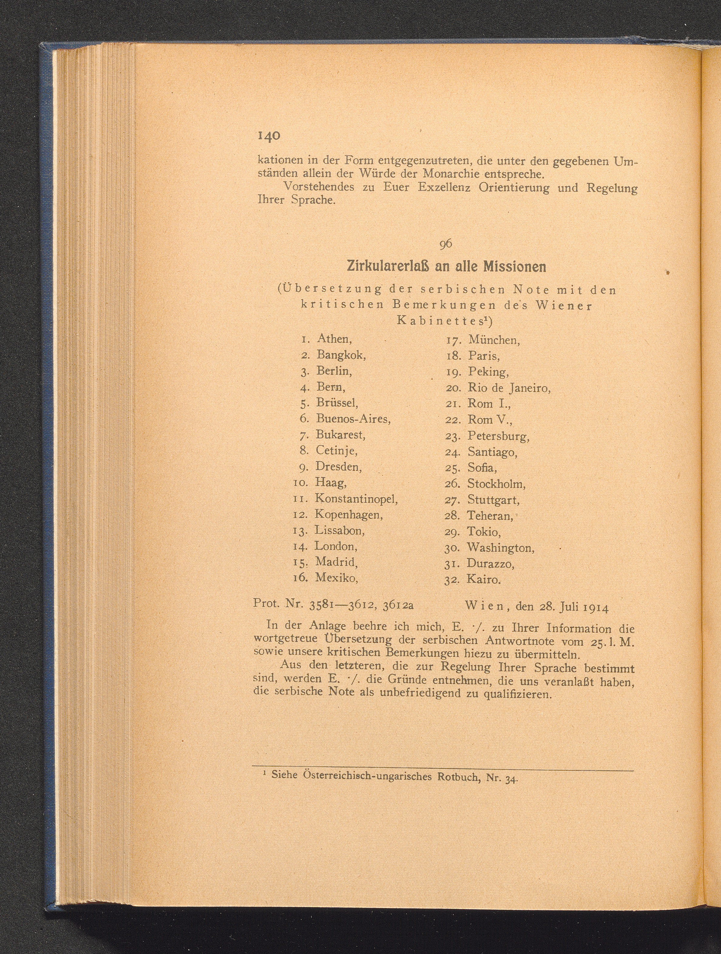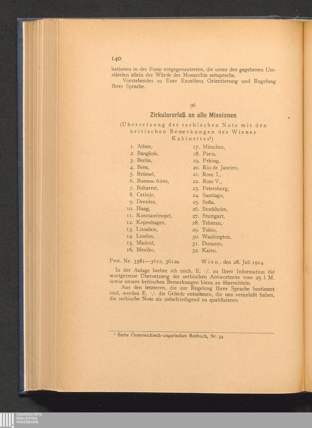 96. Wien, den 28. Juli 1914. Zirkularerlaß an alle Missionen. (Übersetzung der serbischen[...]