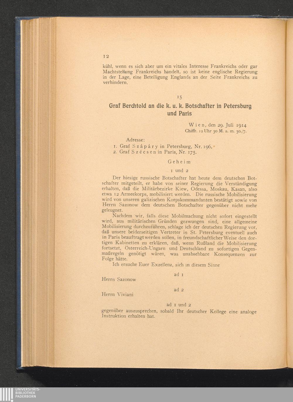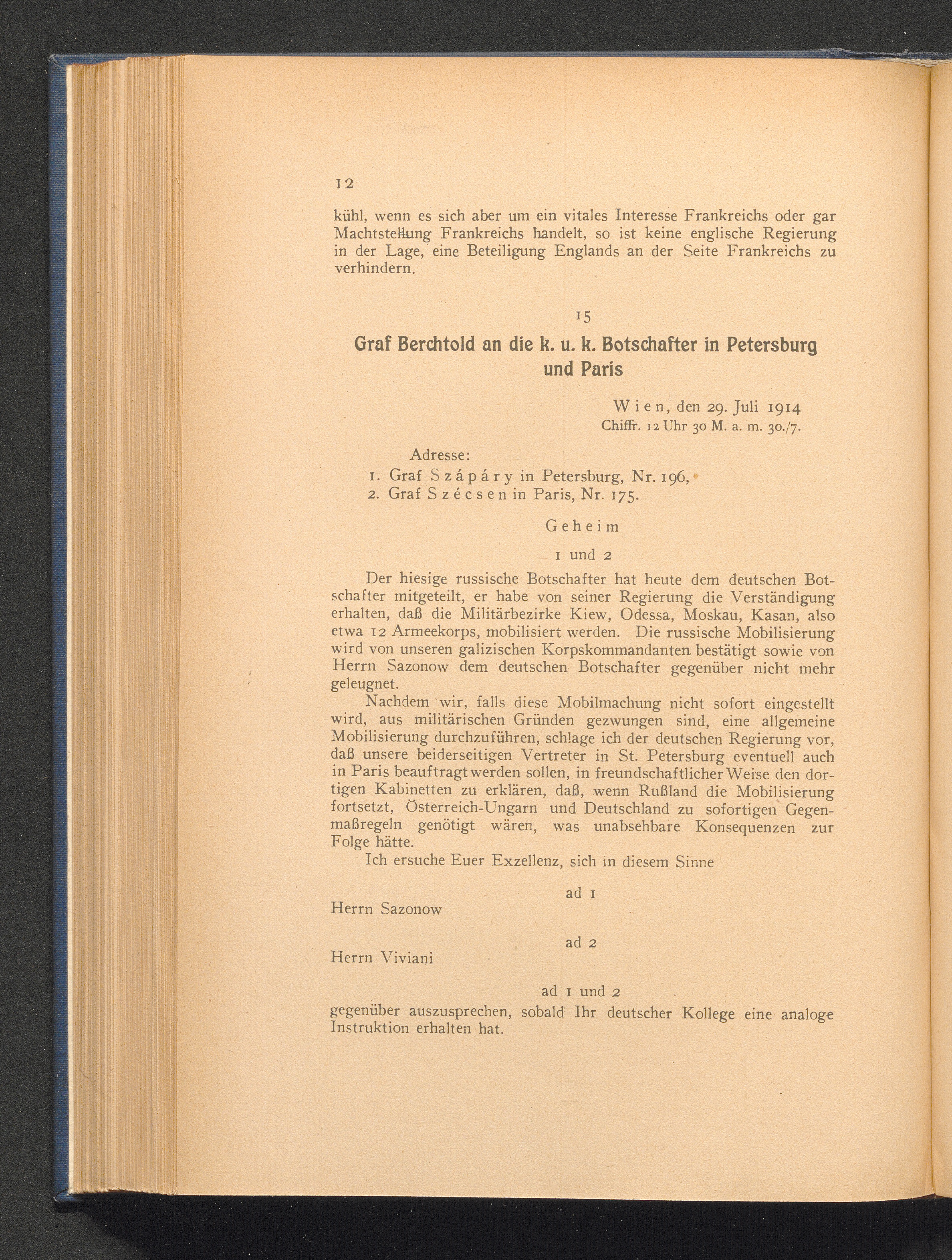 15. Wien, den 29. Juli 1914. Graf Berchtold an die k. u. k. Botschafter in Petersburg[...]
