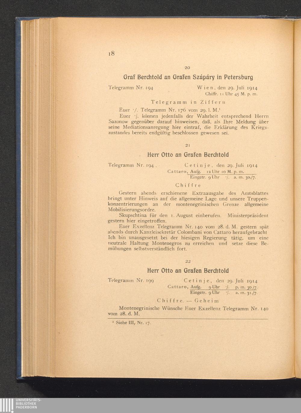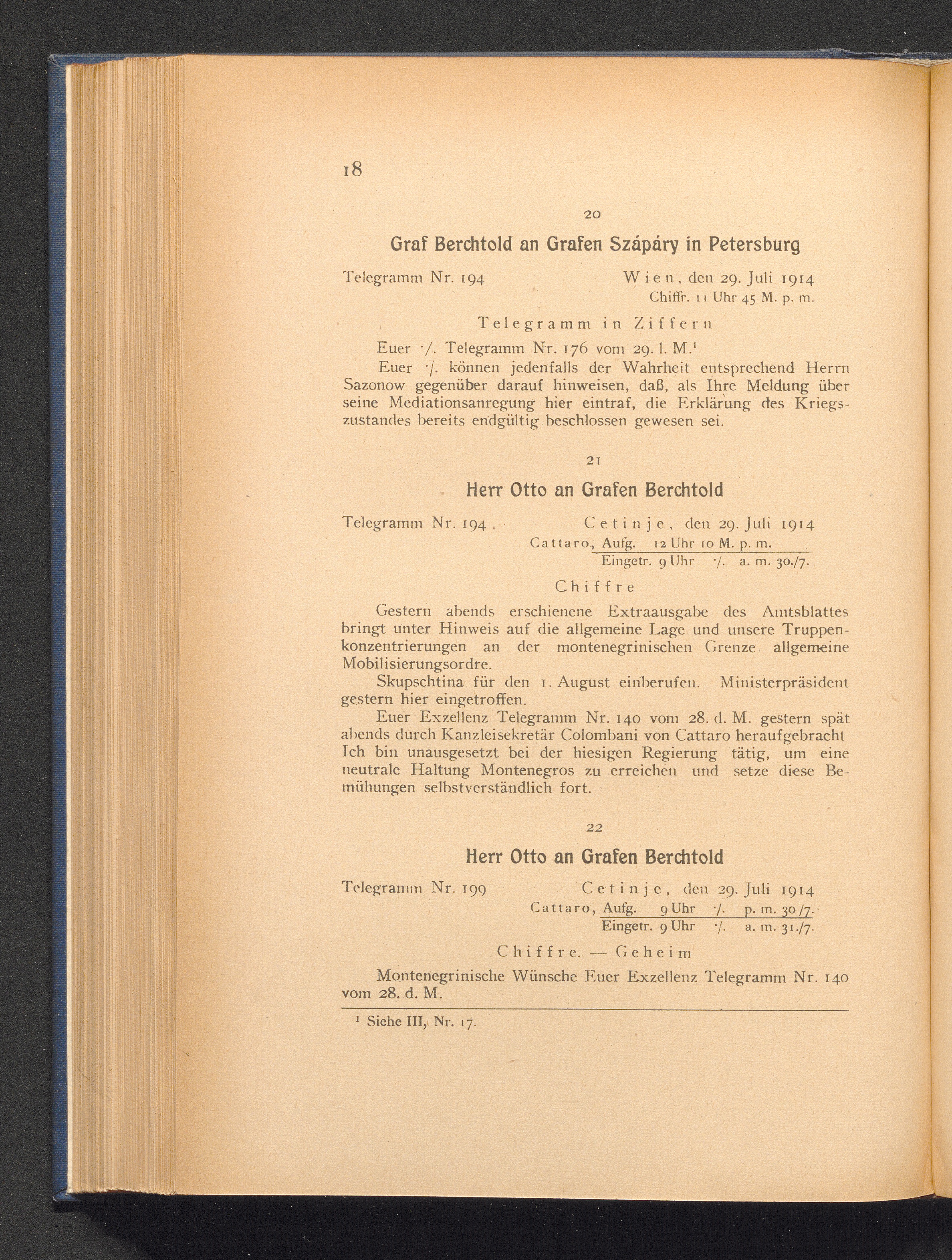 22. Cetinje, den 29. Juli 1914. Herrn Otto an Grafen Berchtold.