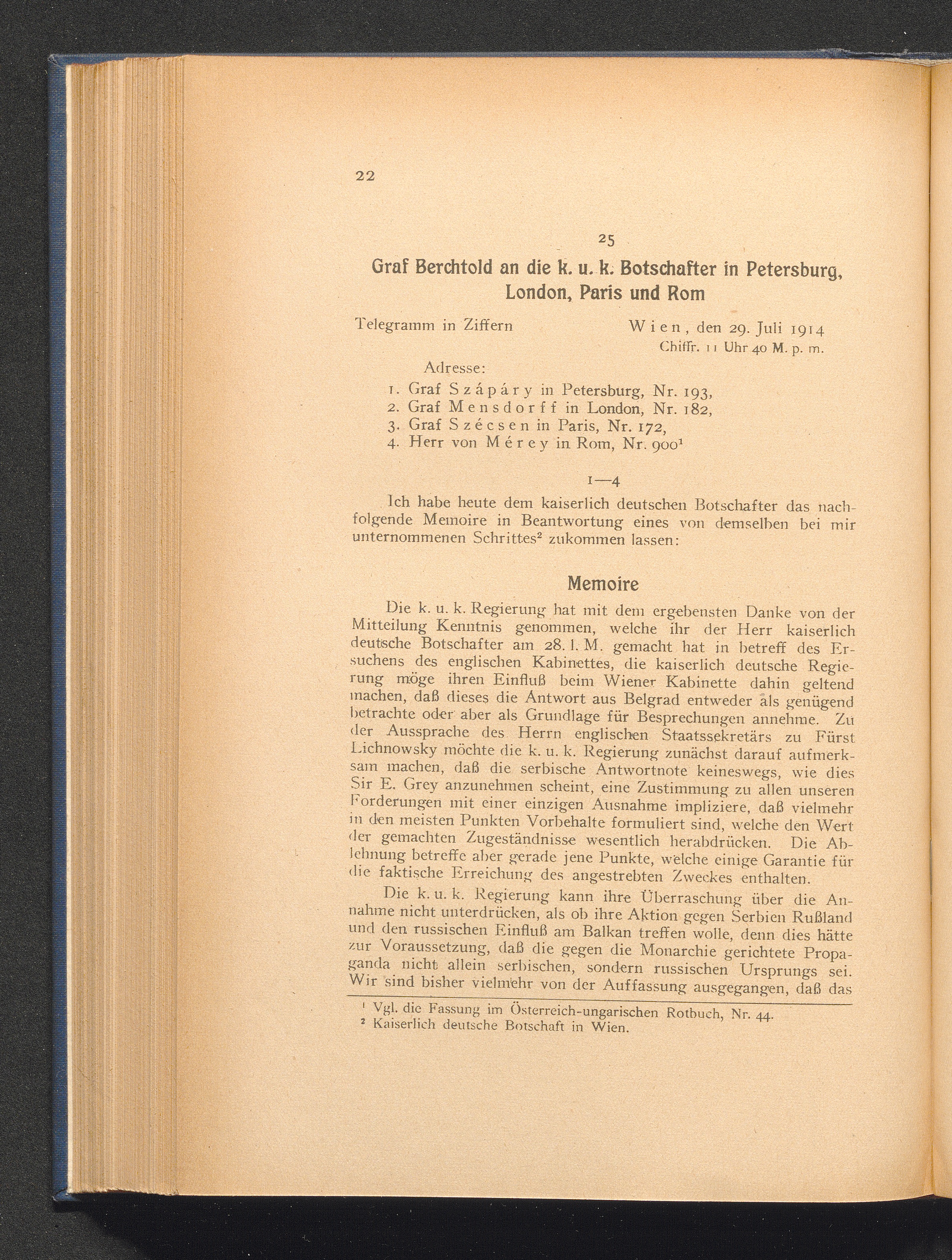 25. Wien, den 29. Juli 1914. Graf Berchtold an die k. u. k. Botschafter in Petersburg,[...]