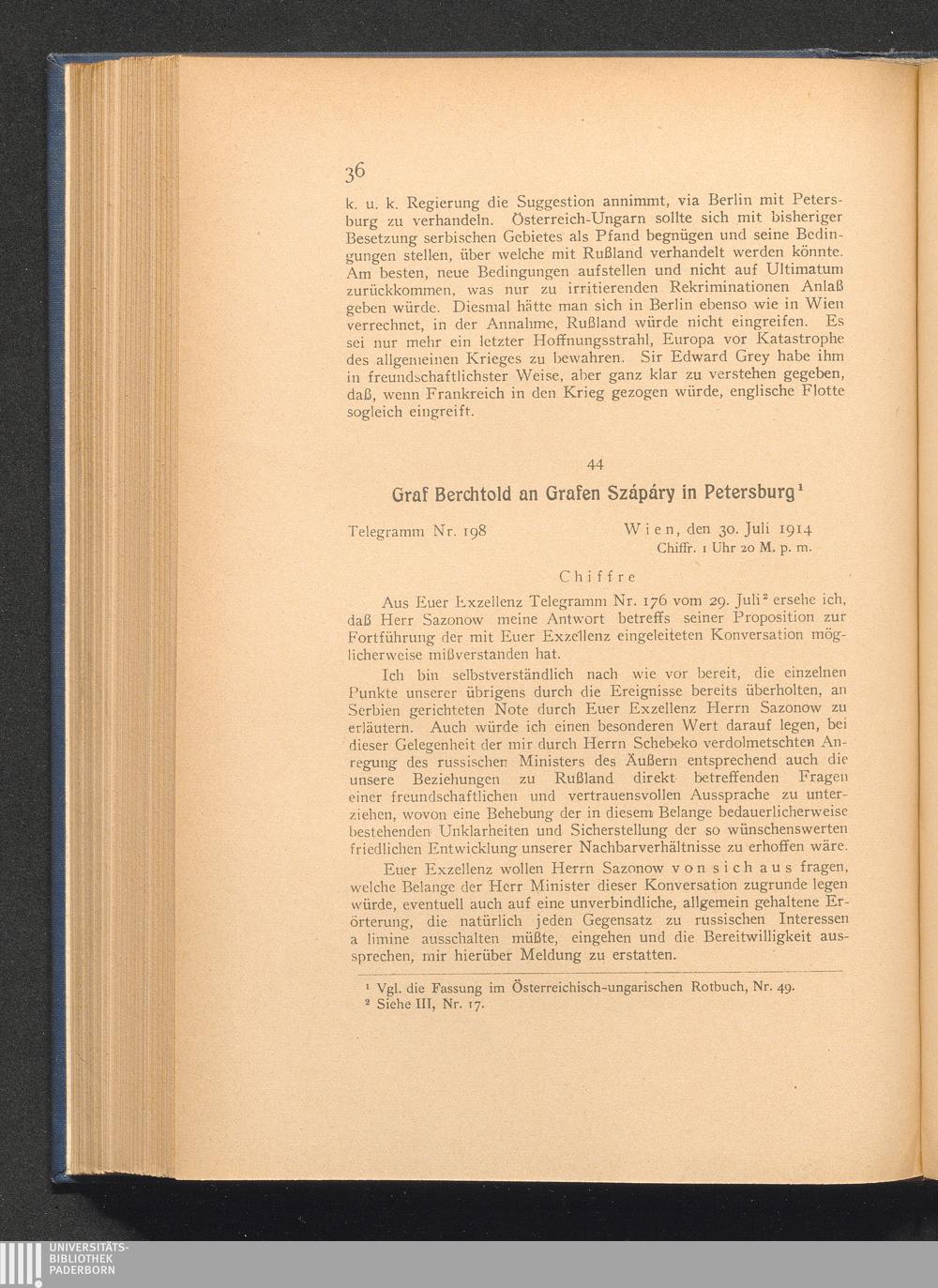 44. Wien, den 30. Juli 1914. Graf Berchtold an Grafen Szápáry in Petersburg.