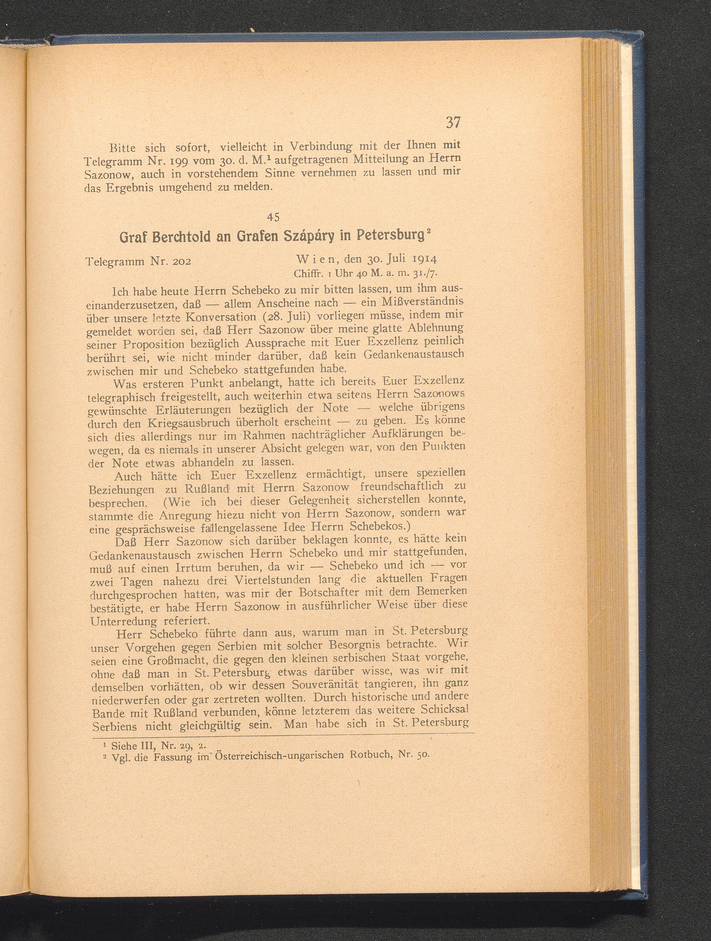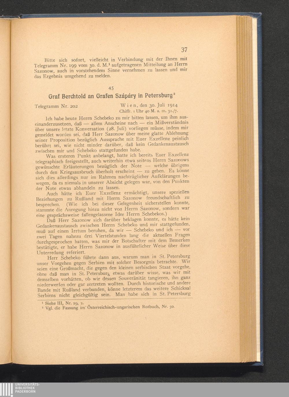 45. Wien, den 30. Juli 1914. Graf Berchtold an Grafen Szápáry in Petersburg.