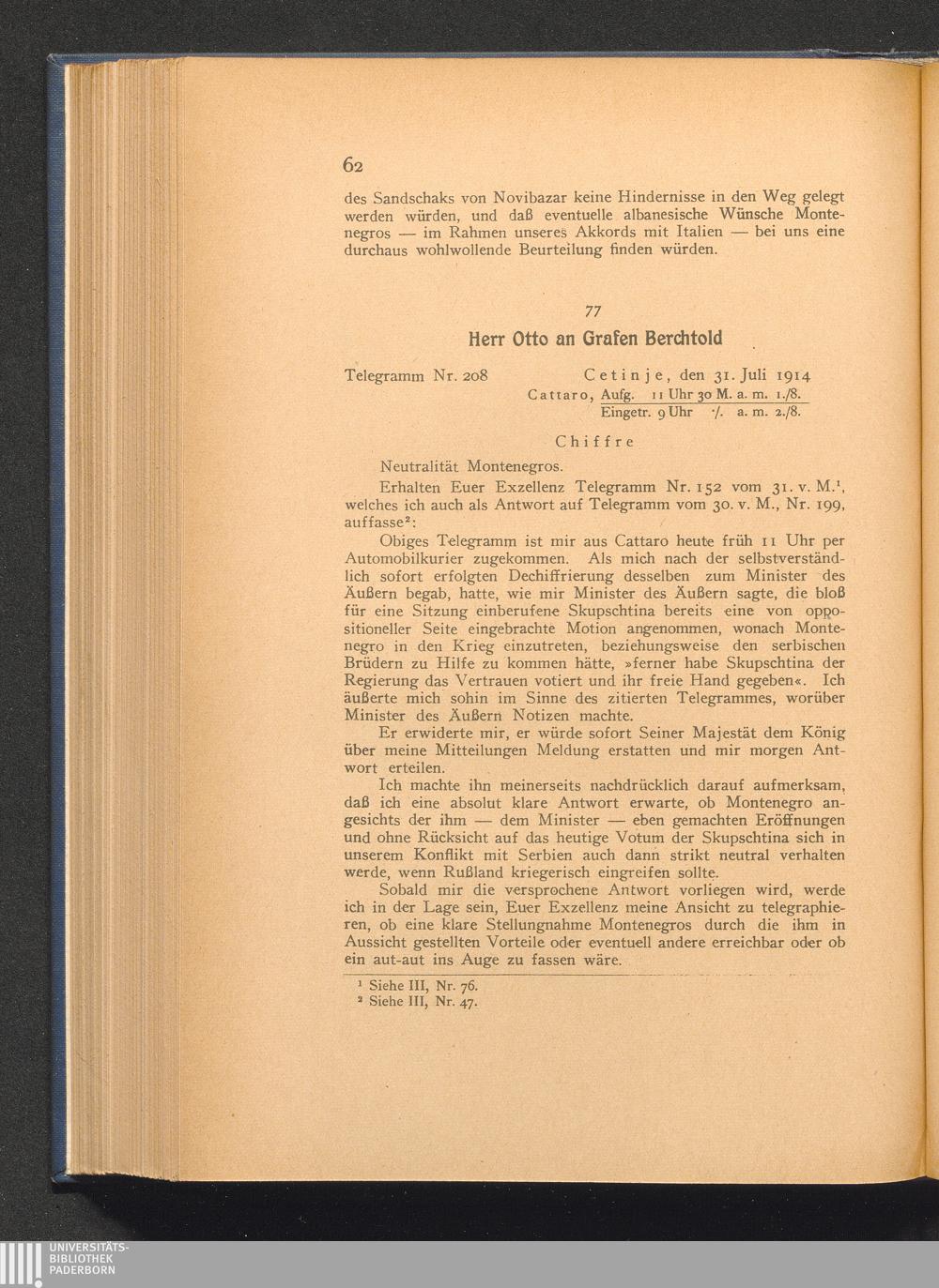 77. Cetinje, den 31. Juli 1914. Herrn Otto an Grafen Berchtold.