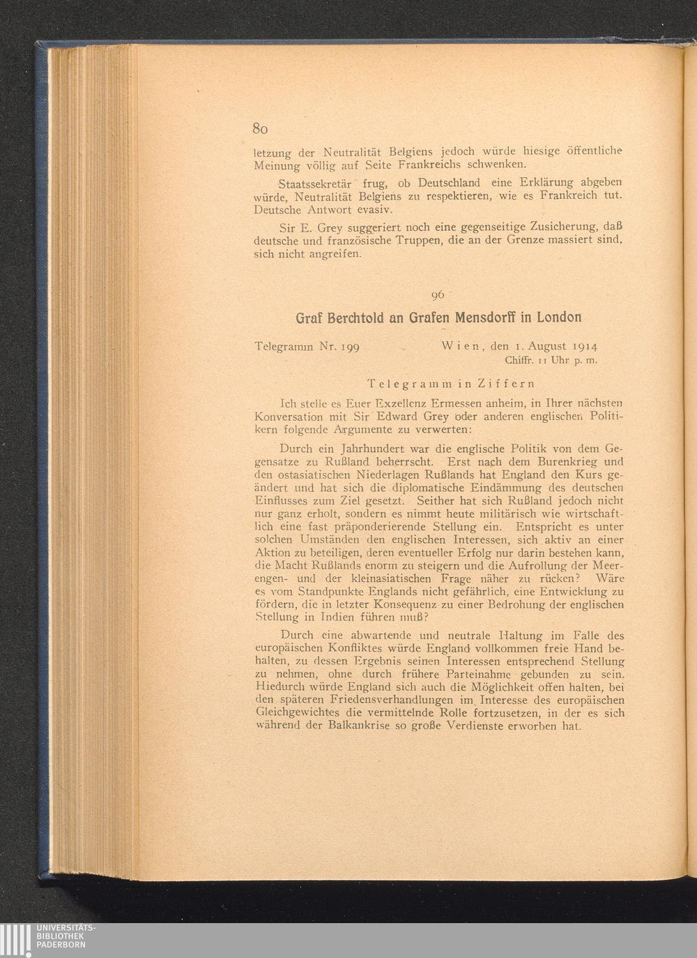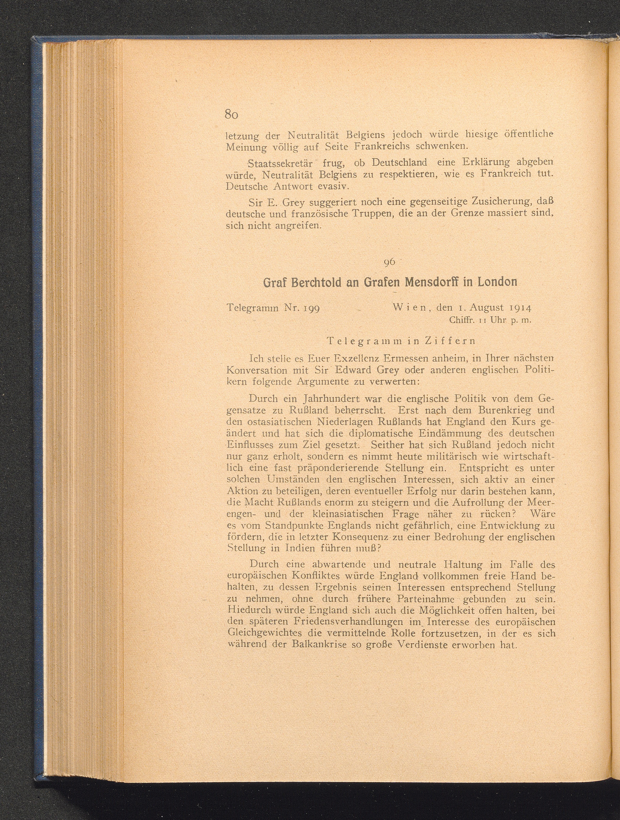 96. Wien, den 1. August 1914. Graf Berchtold an Grafen Mensdorf in London.