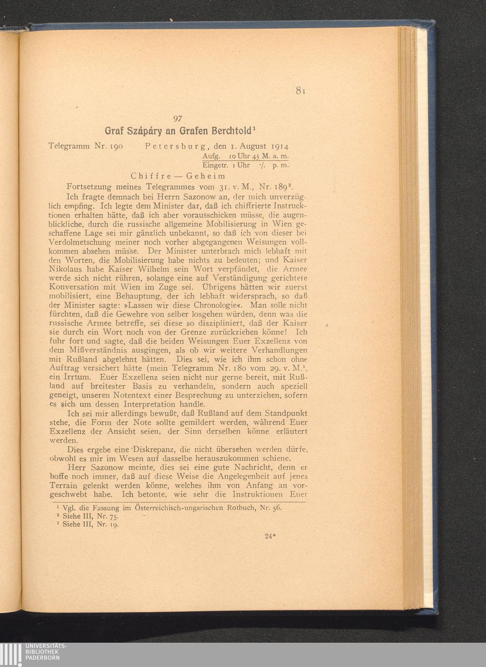 97. Petersburg, den 1. August 1914. Graf Szápáry an Grafen Berchtold