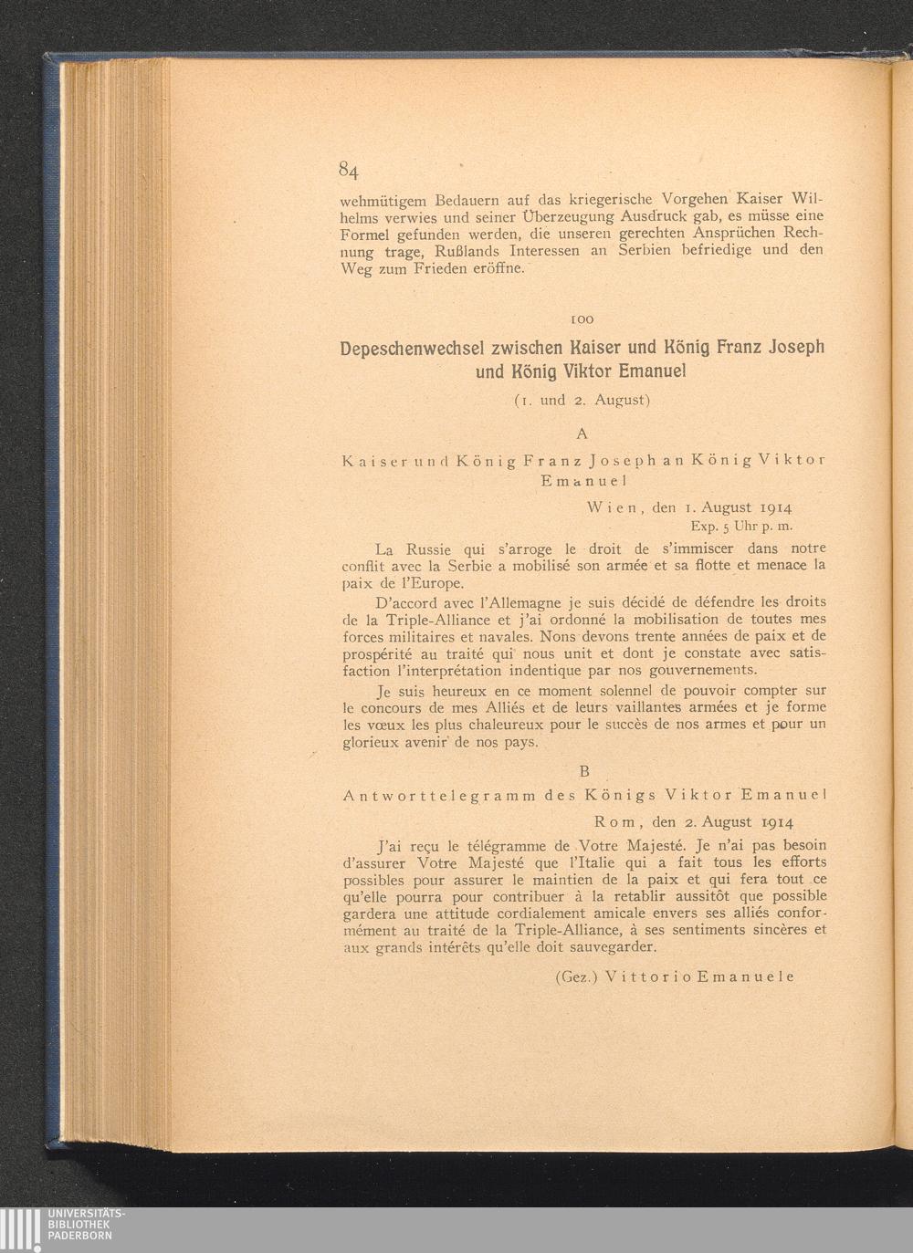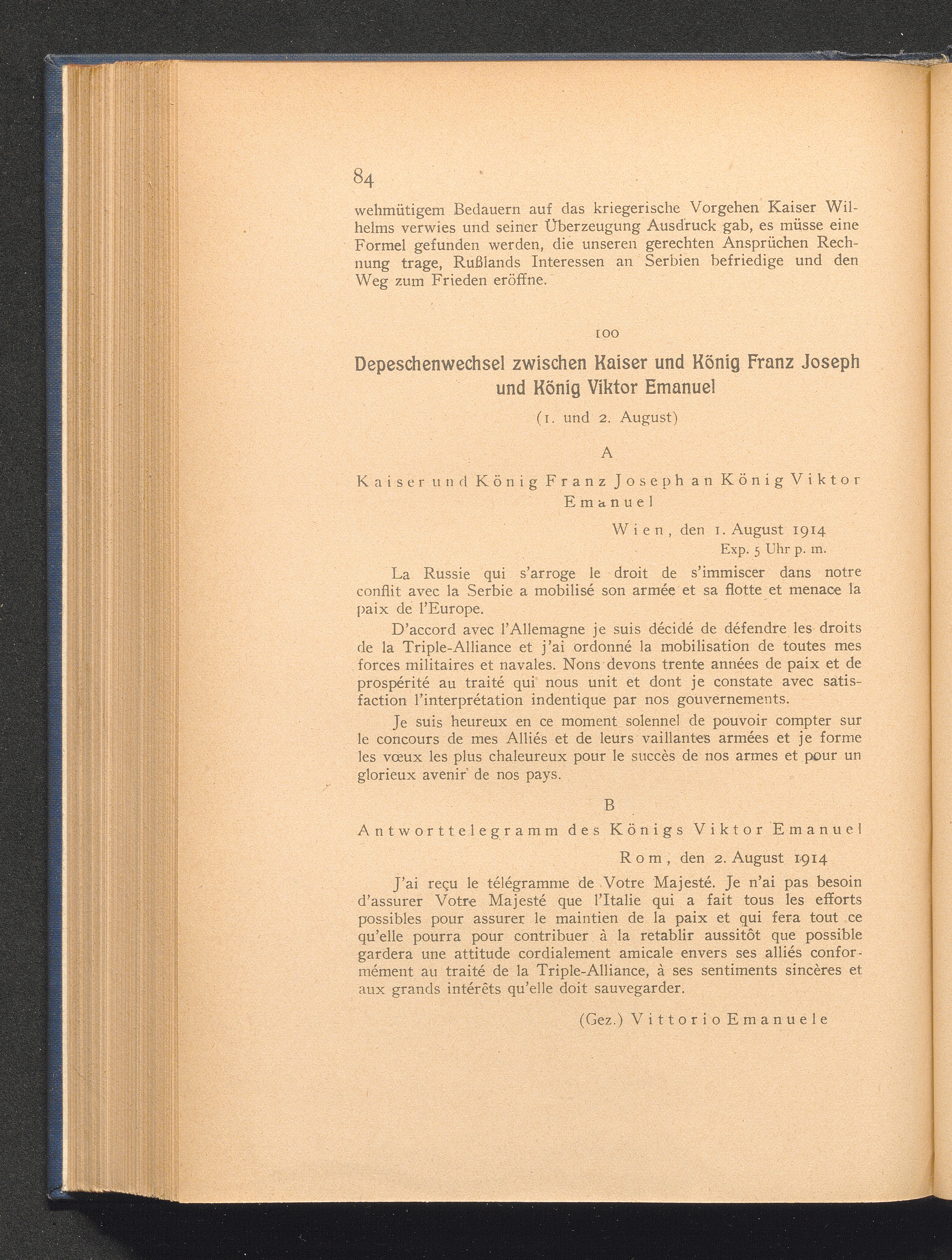 100. Wien, den 1. August 1914. Rom den 2. August 1914. Depeschenwechsel zwischen[...]