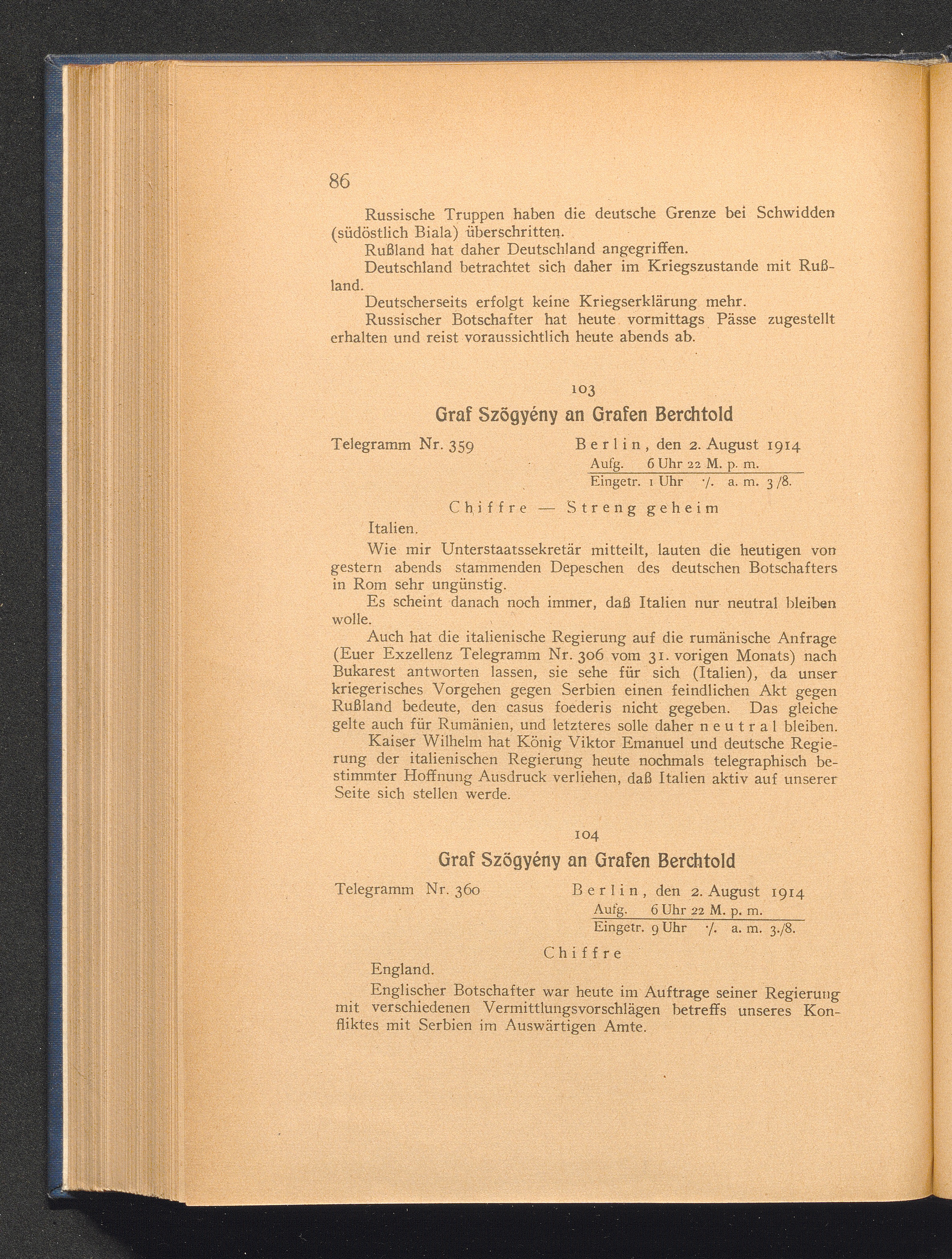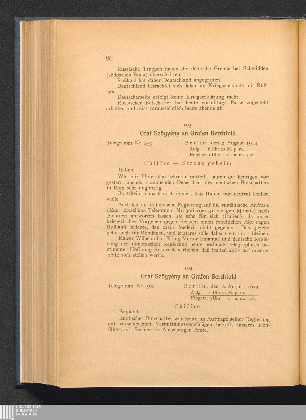 104. Berlin, den 2. August 1914. Graf Szögyény an Grafen Berchtold.