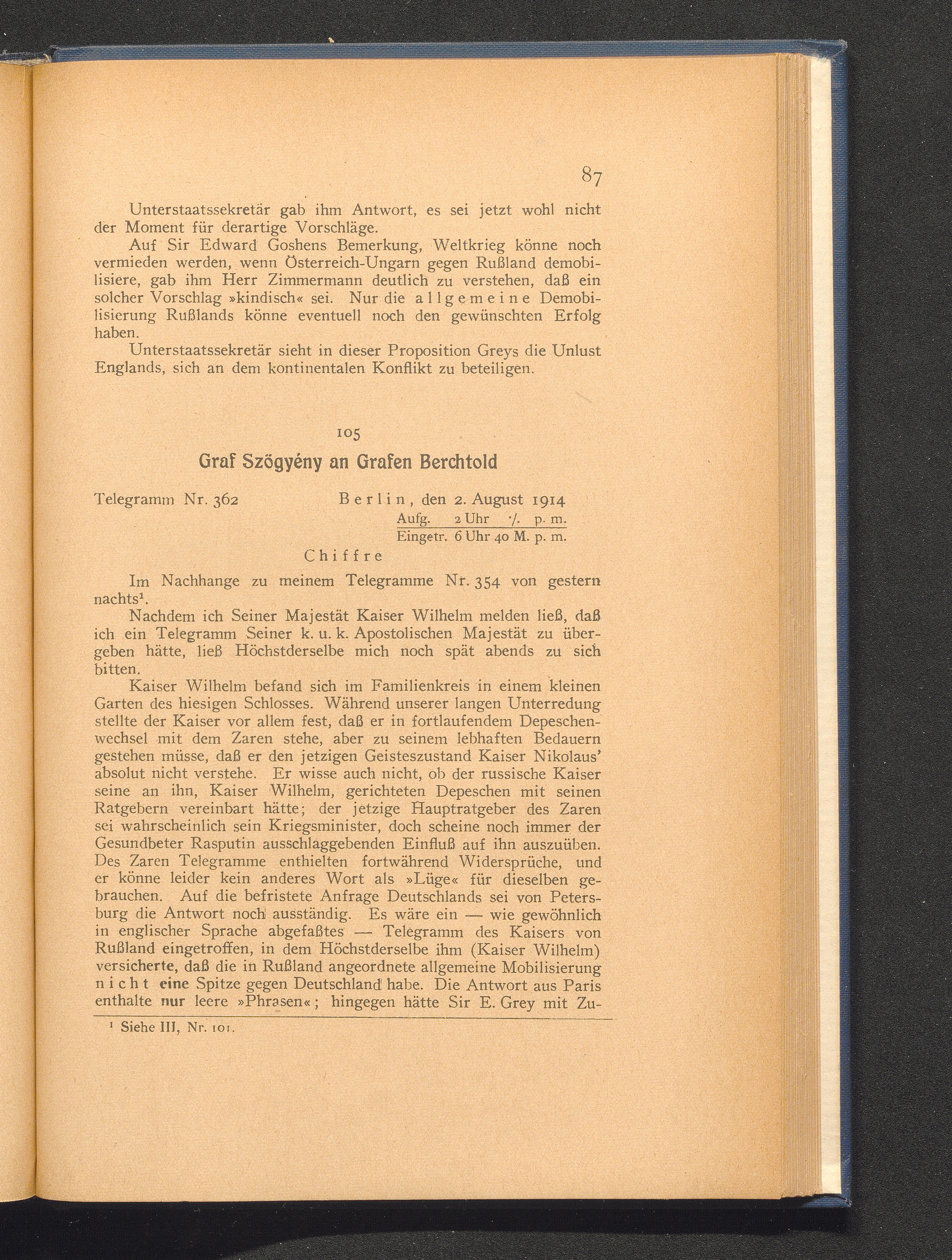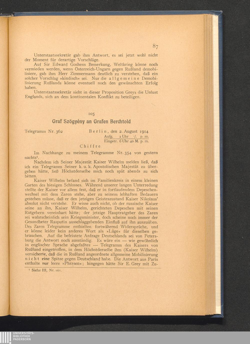 105. Berlin, den 2. August 1914. Graf Szögyény an Grafen Berchtold.