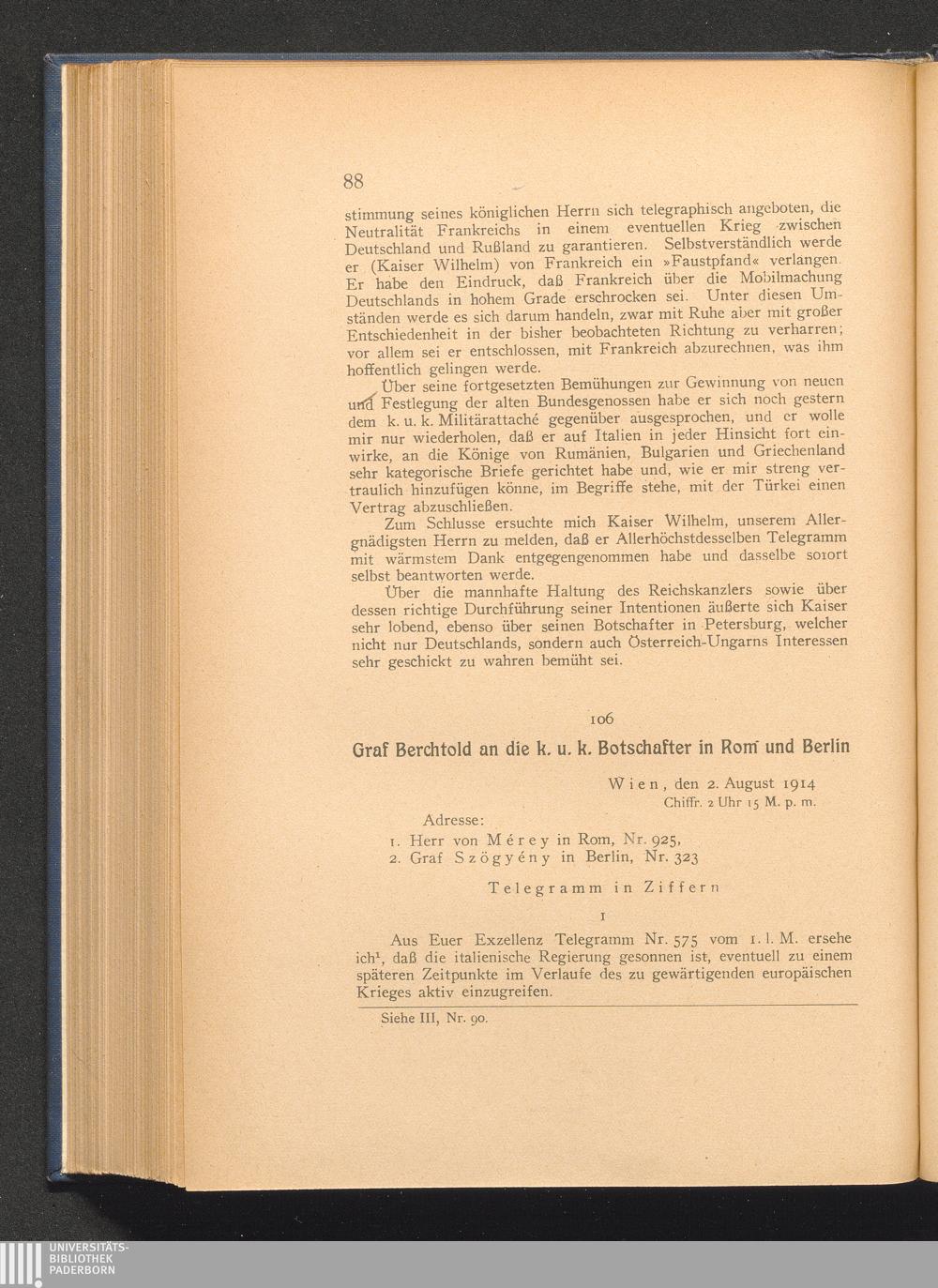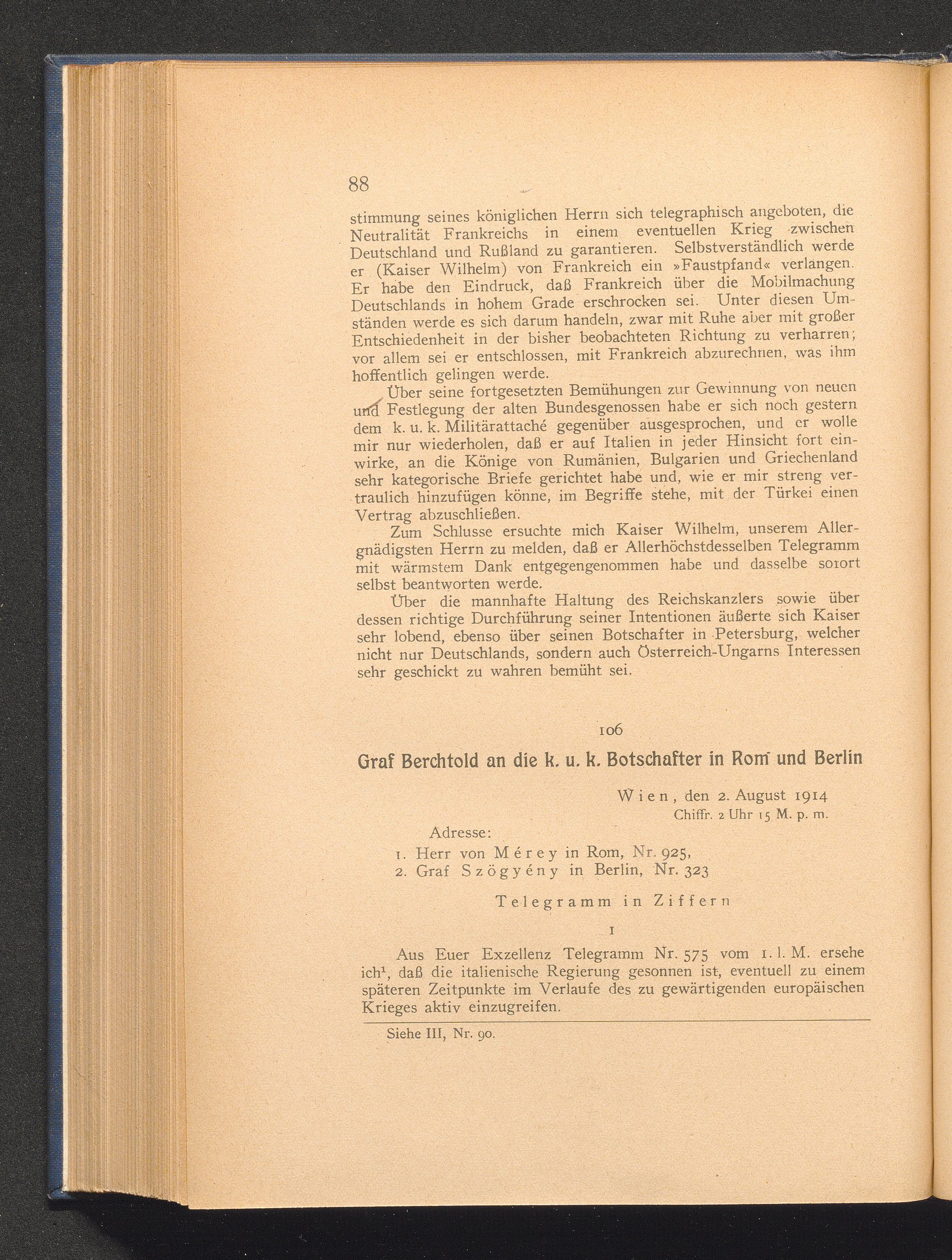 106.. Wien, den 2. Augusti 1914. Graf Berchtold an die k. u. k. Botschafter in Rom[...]