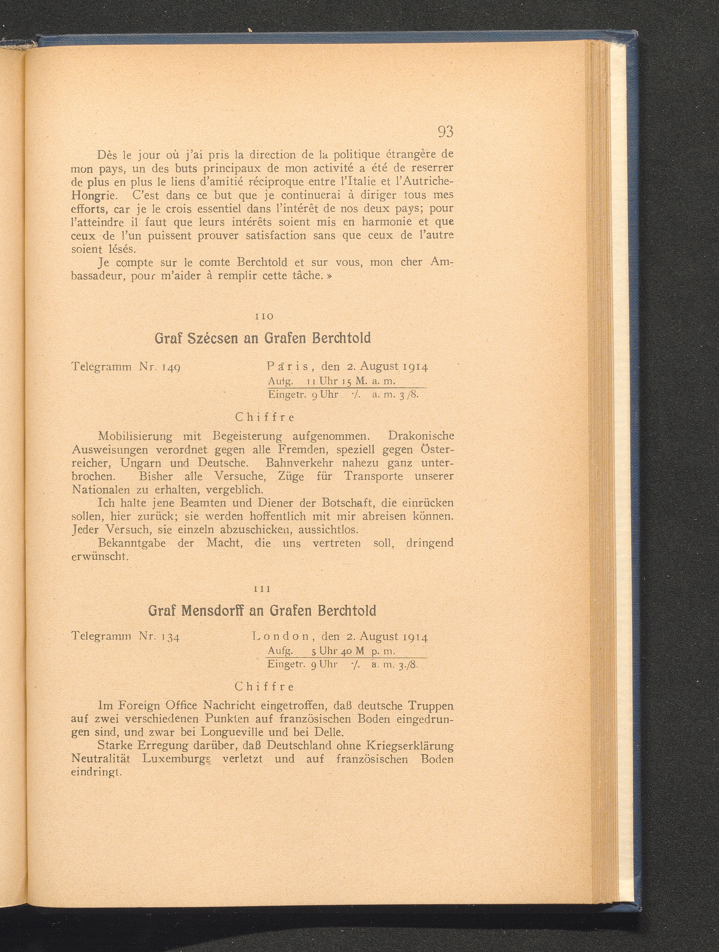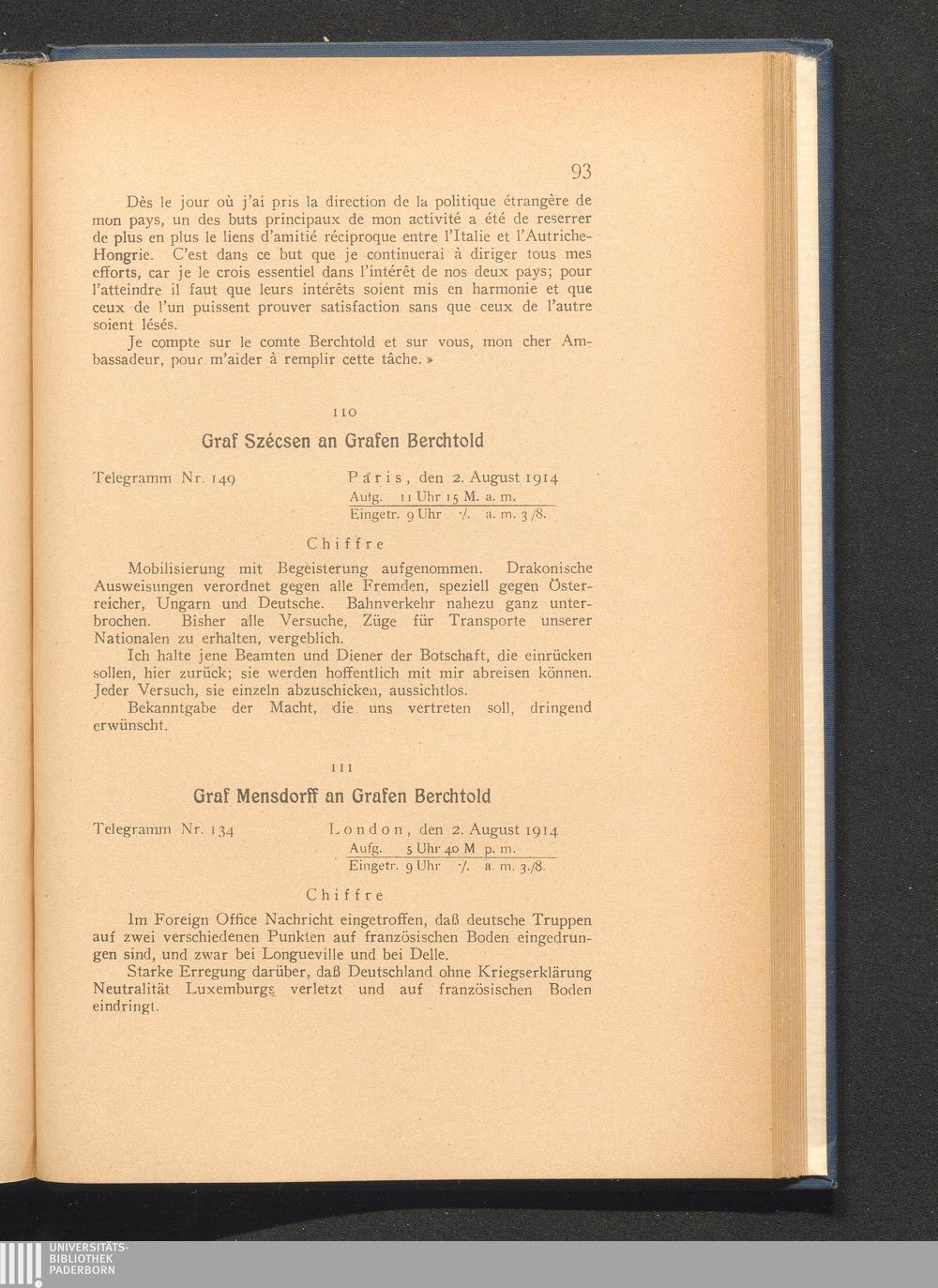 111. London, den 2. August 1914. Graf Mensdorff an Grafen Berchtold.