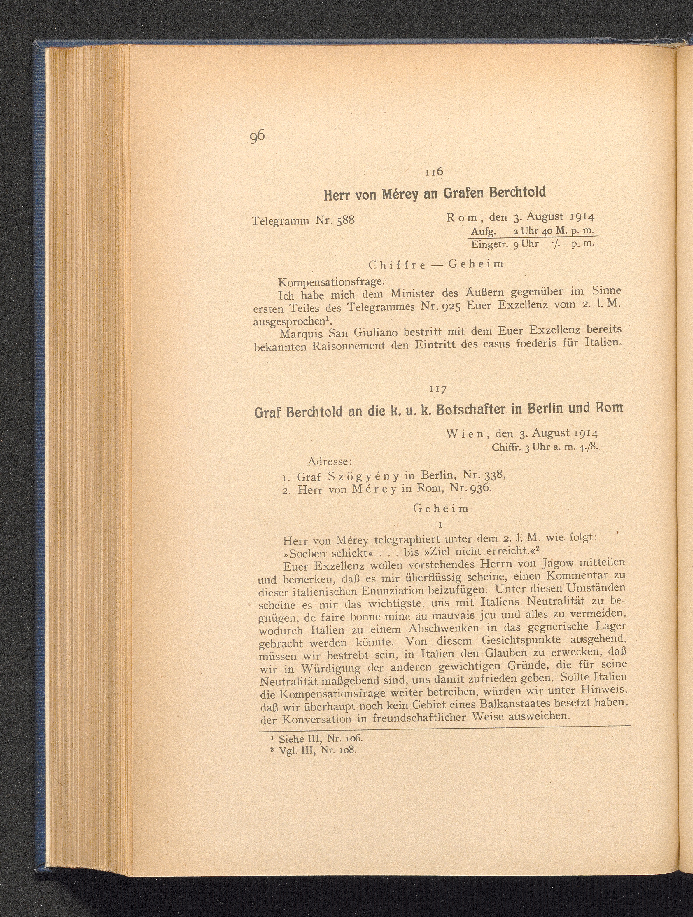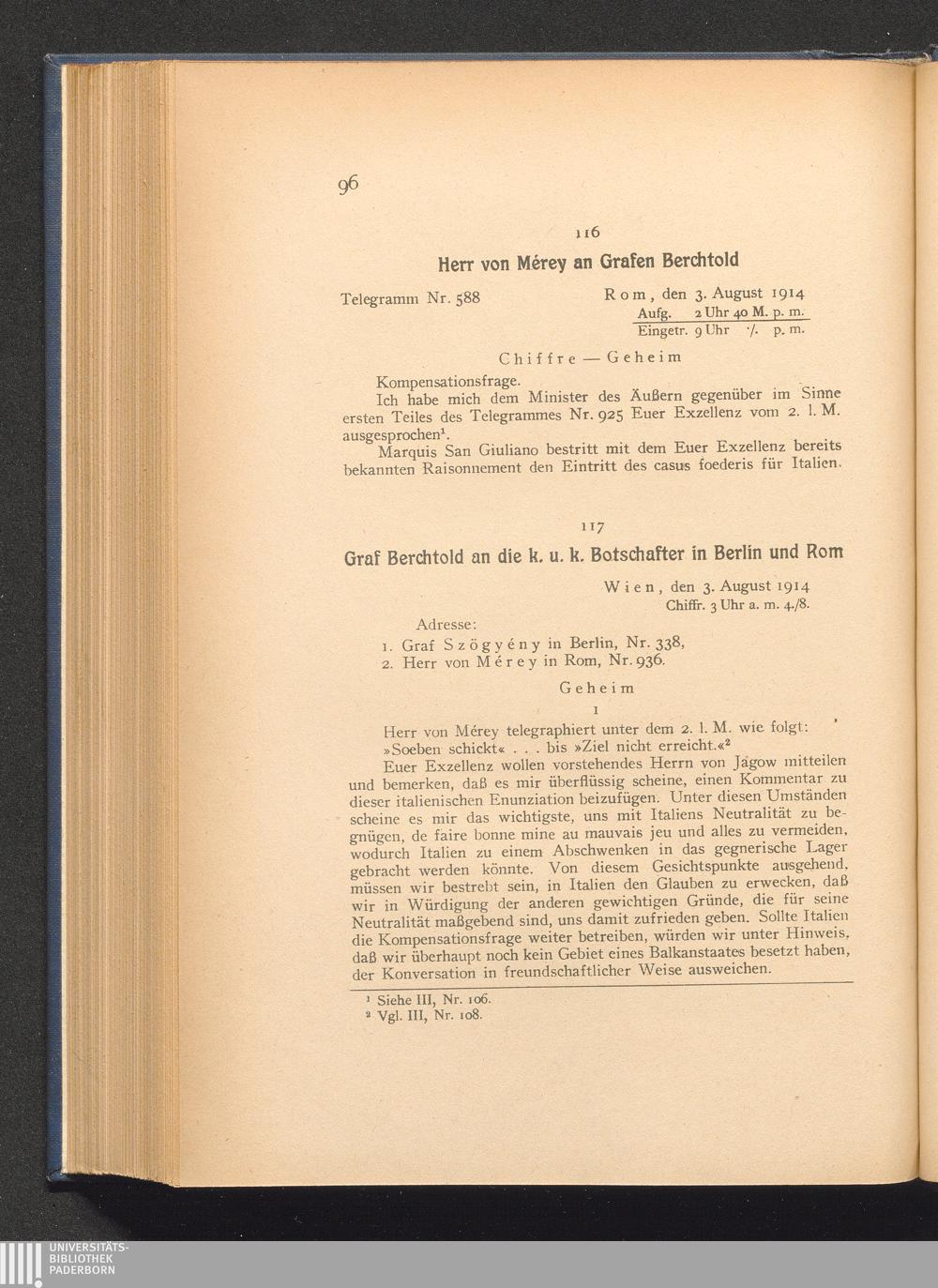 117. Wien, den 3. August 1914. Graf Berchtold an die k. u. k. Botschafter in Berlin[...]