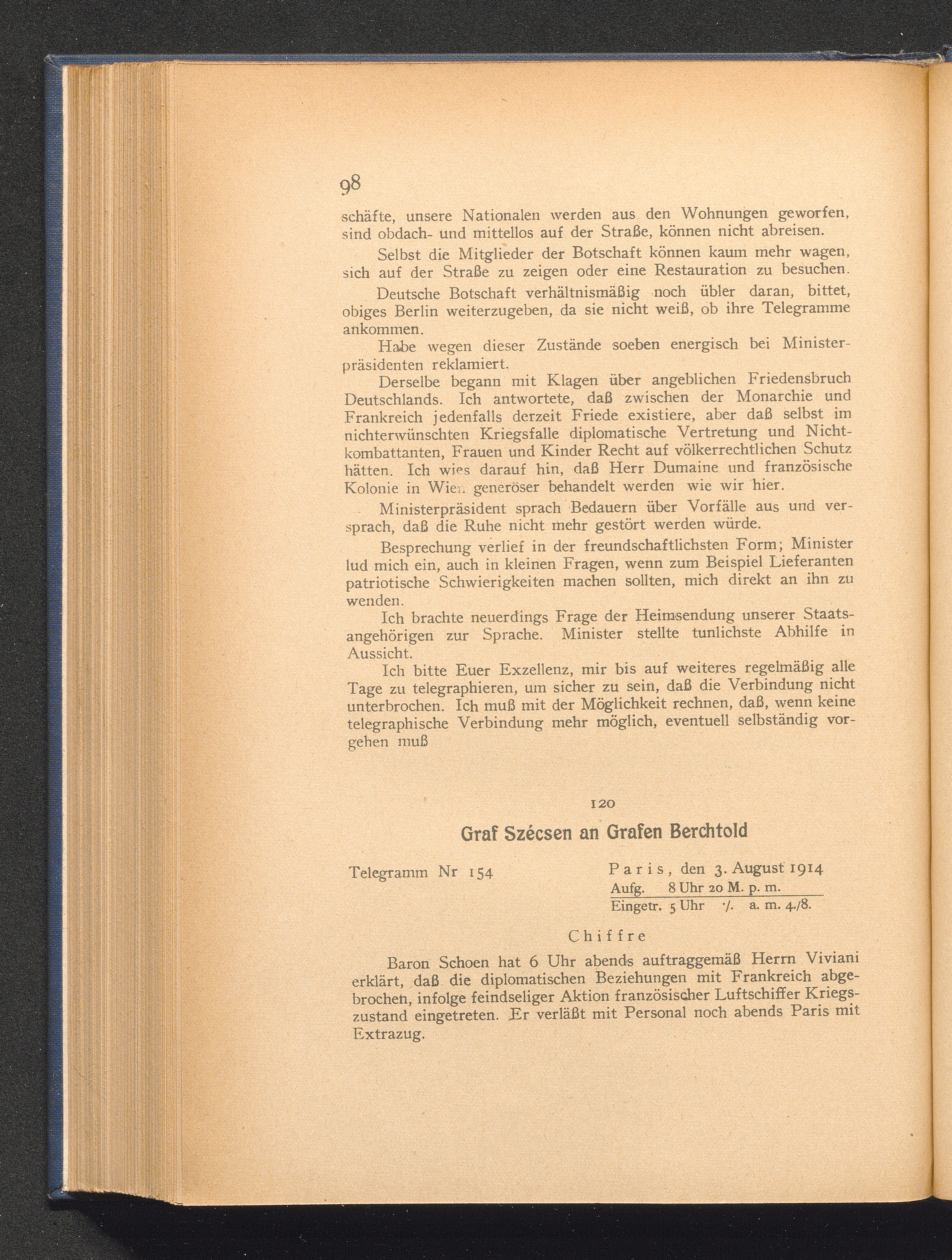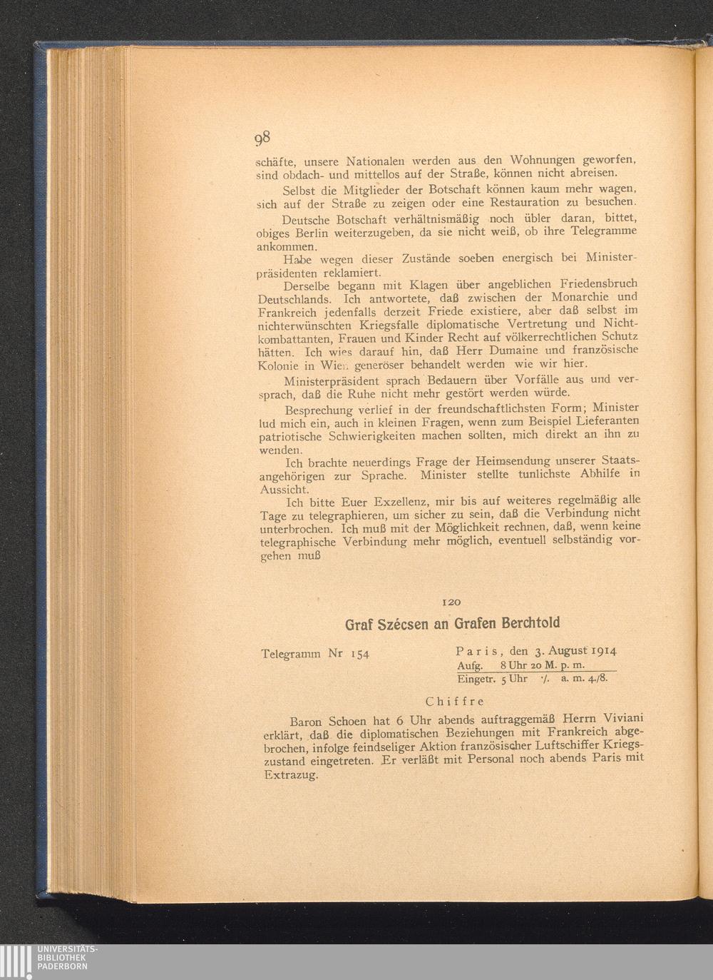 120. Paris, den 3. August 1914. Graf Szécsen an Grafen Berchtold.