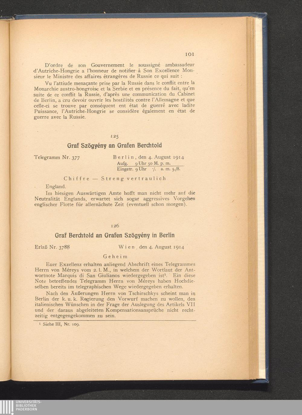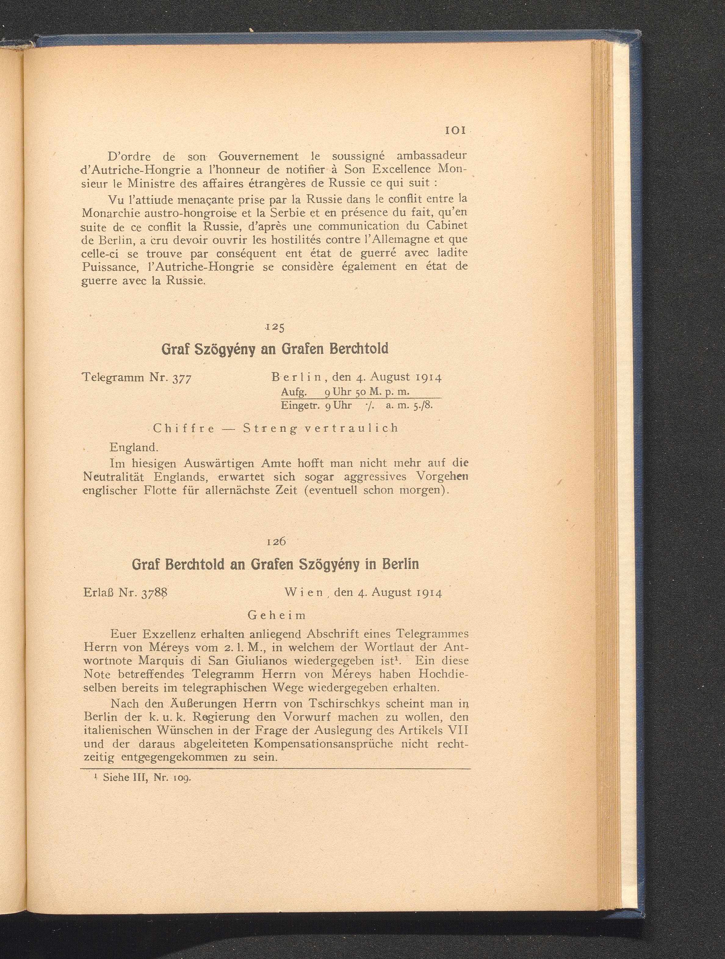 125. Berlin, den 4. August 1914. Graf Szögyény an Grafen Berchtold.