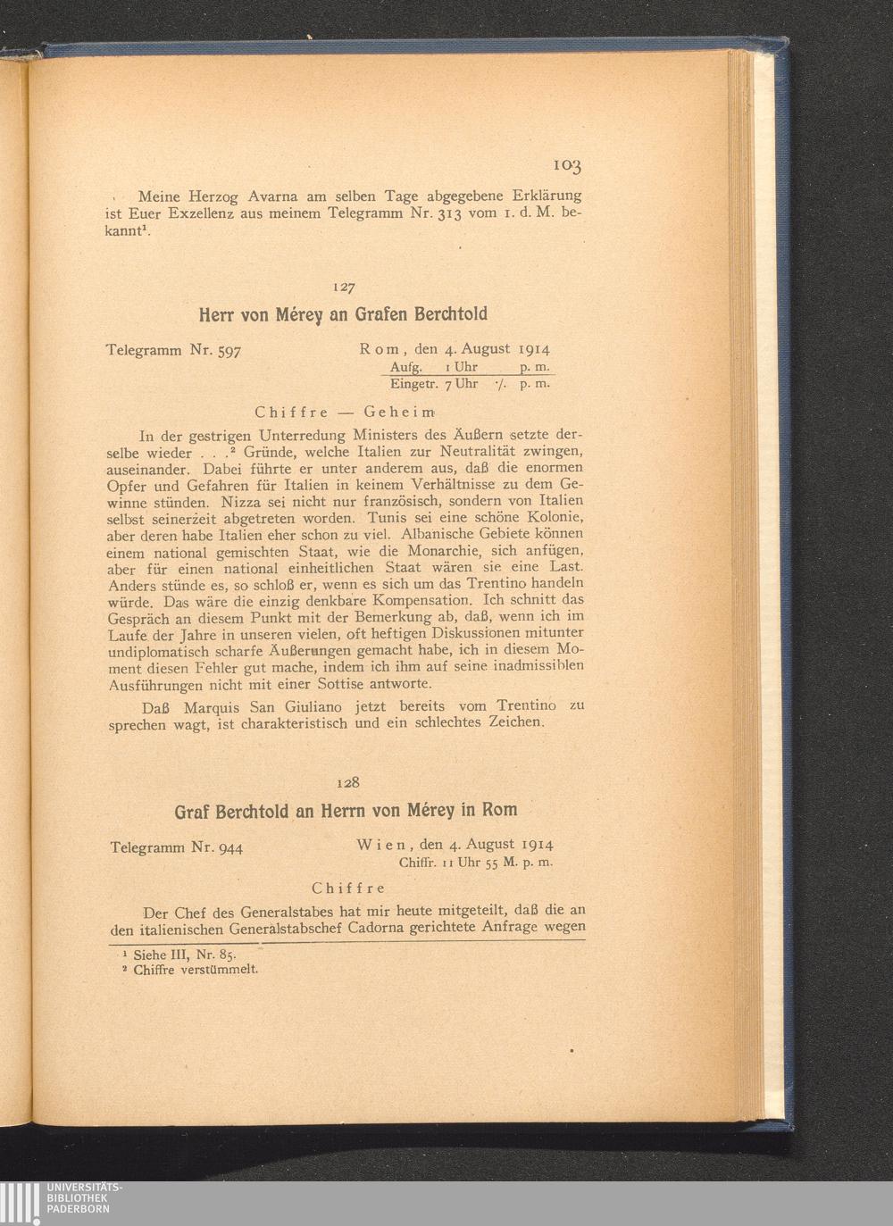 127. Rom, den 4. August 1914. Herr von Mérey an Grafen Berchtold.