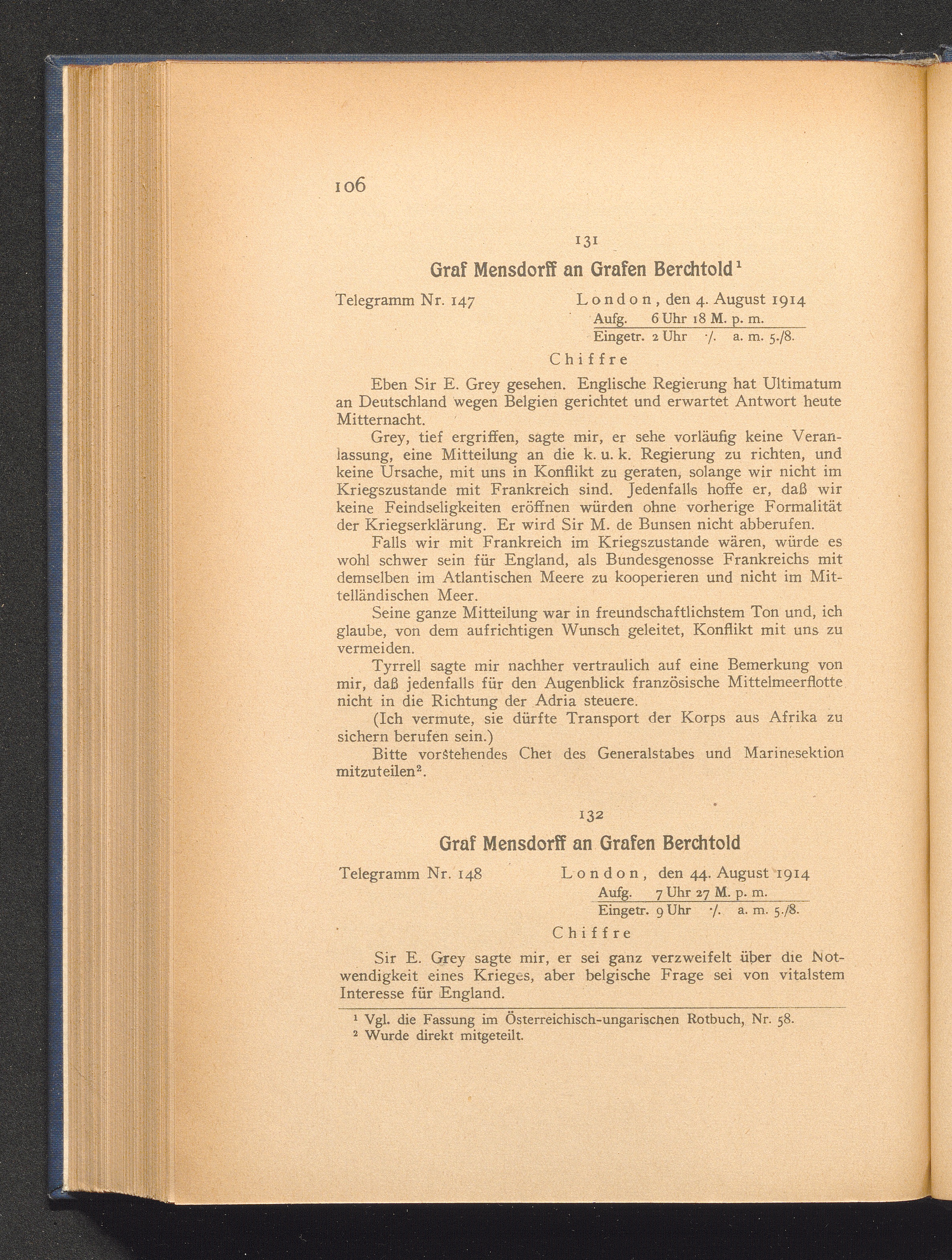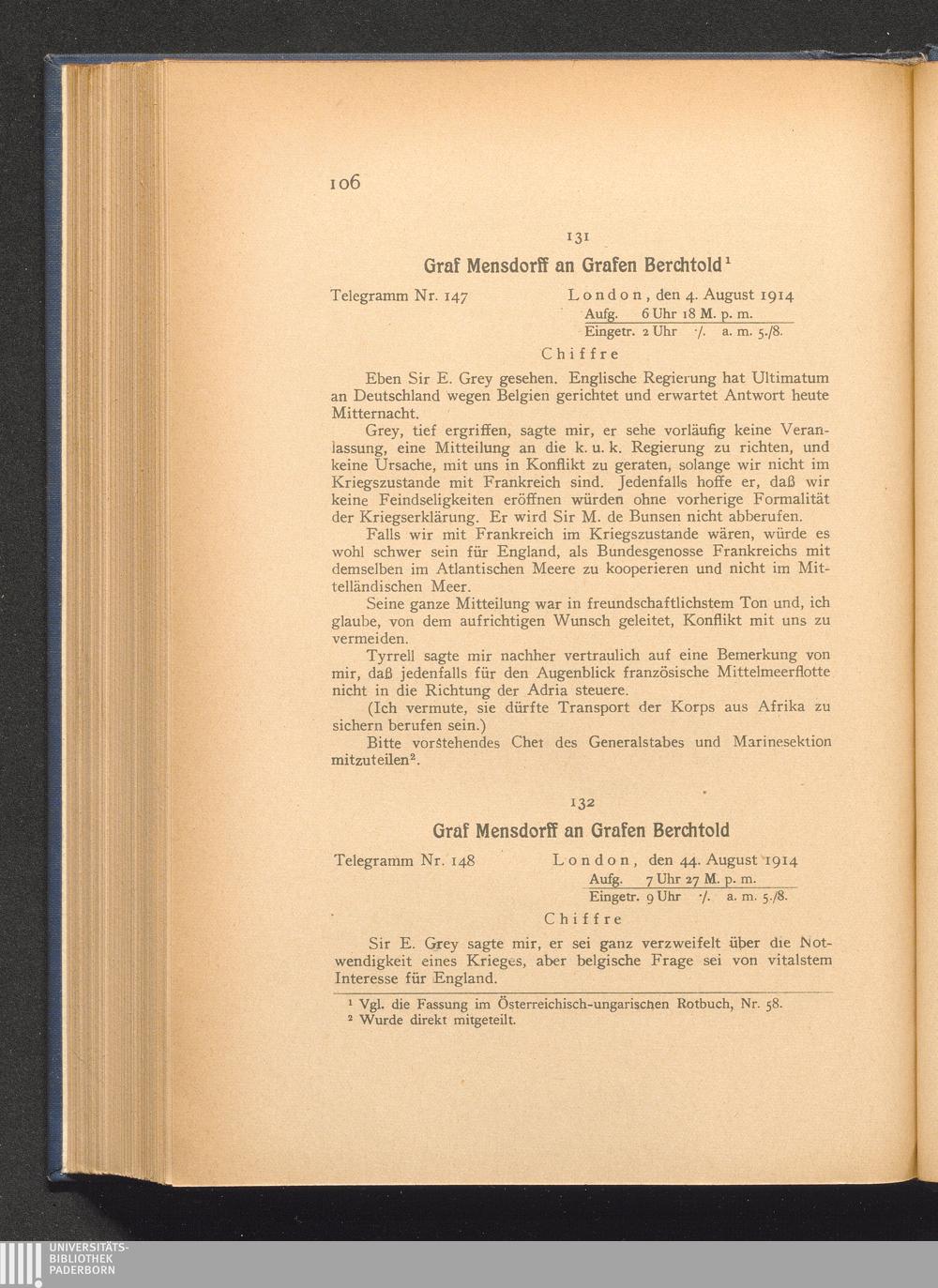 132. London, den 4. August 1914. Graf Mensdorff an Grafen Berchtold.