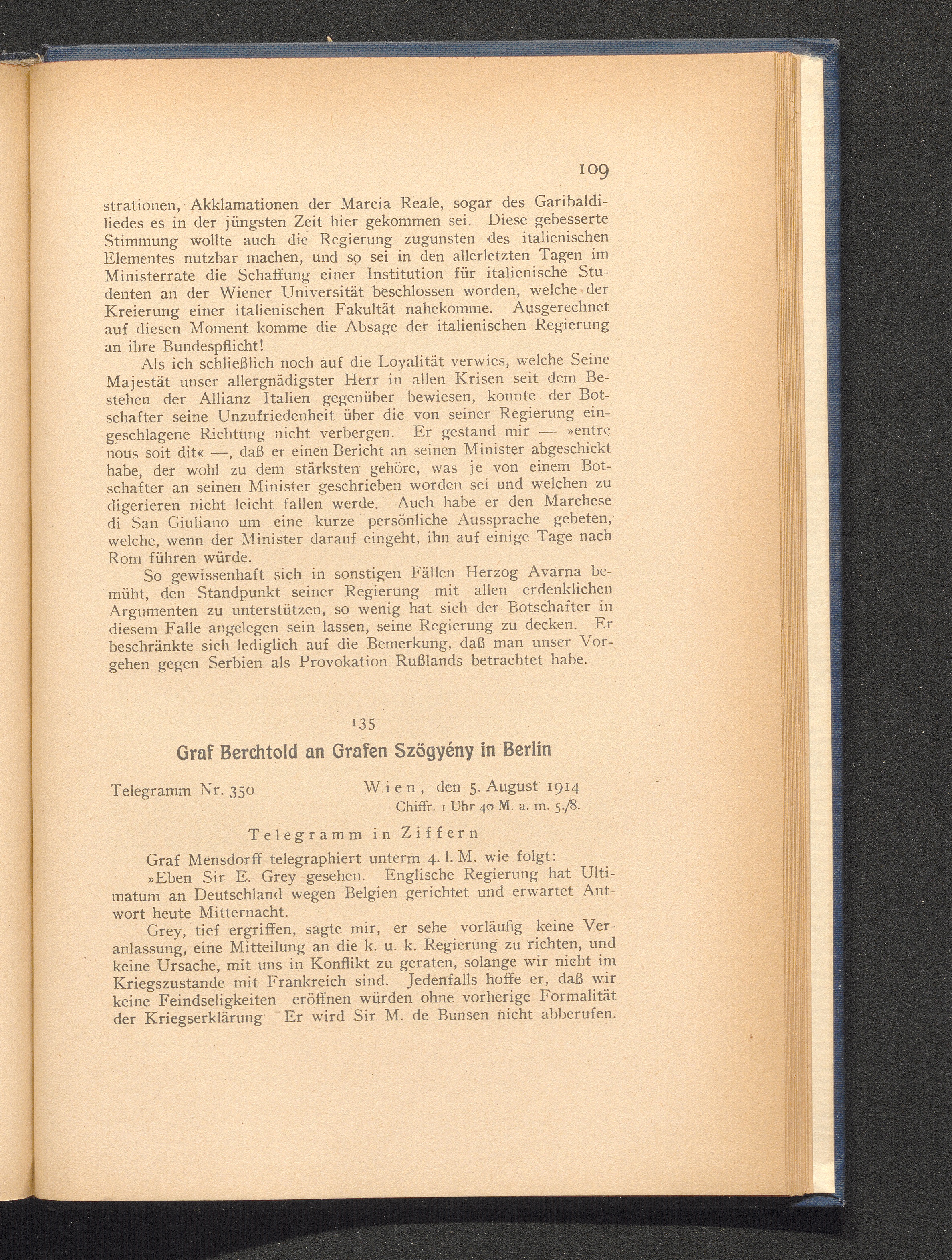 135.Wien, den 5. August 1914. Graf Berchtod an Grafen Szögyény in Berlin.