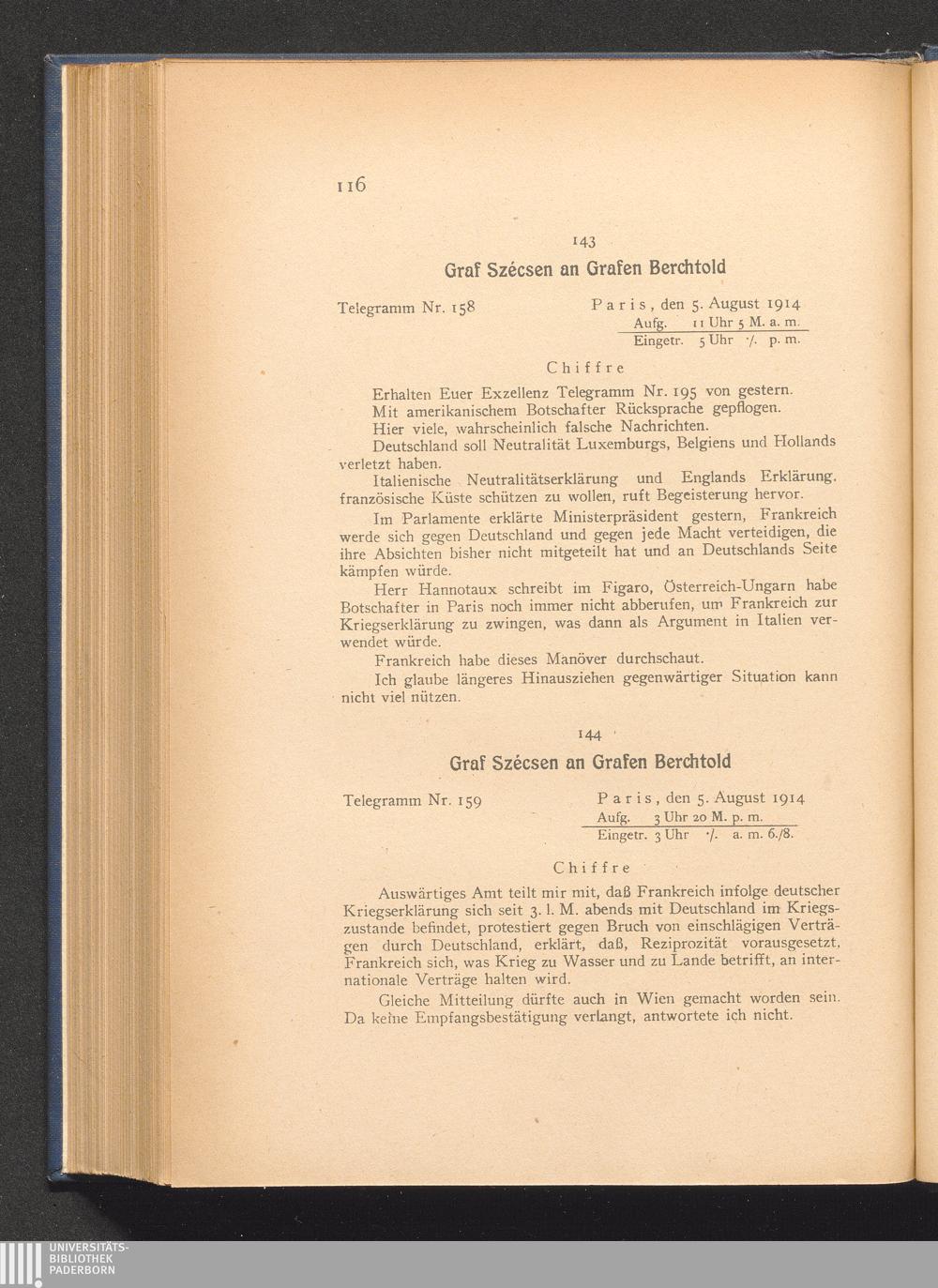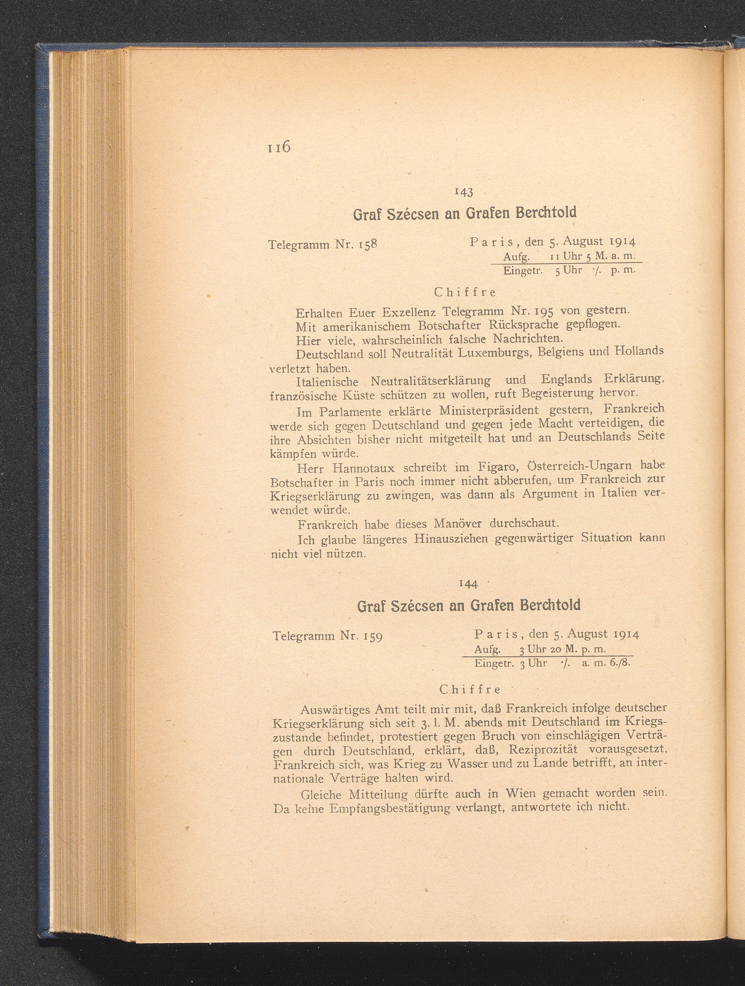 143. Paris, den 5. August 1914. Graf Szécsen an Grafen Berchtold.
