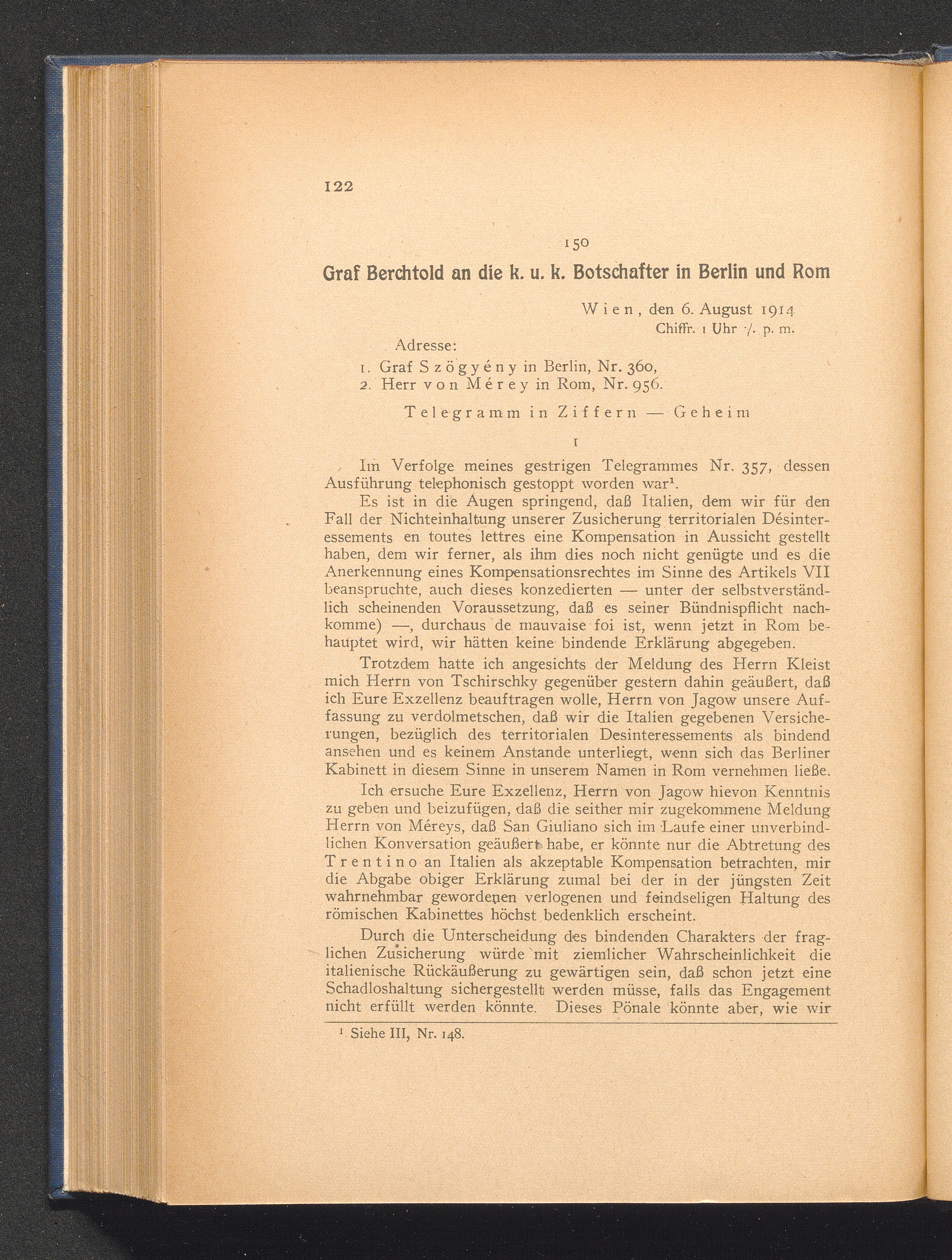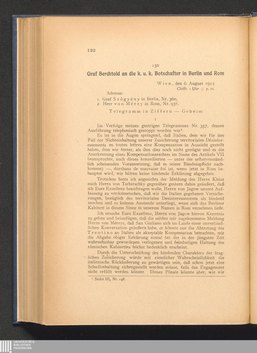 150. Wien, den 6. Augusti 1914. Graf Berchtold an die k. u. k. Botschafter in Berlin[...]