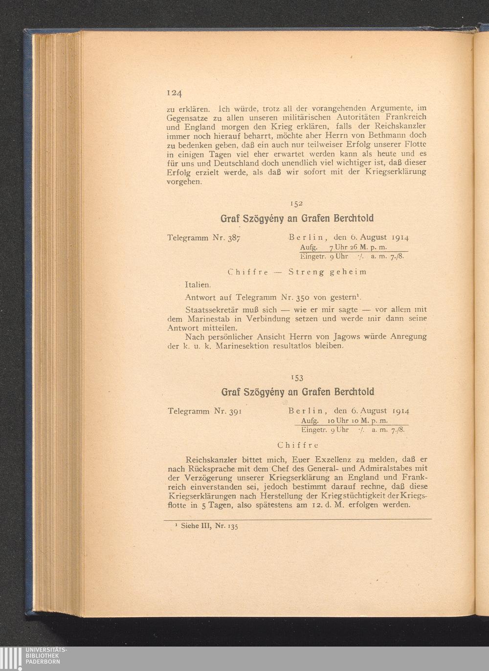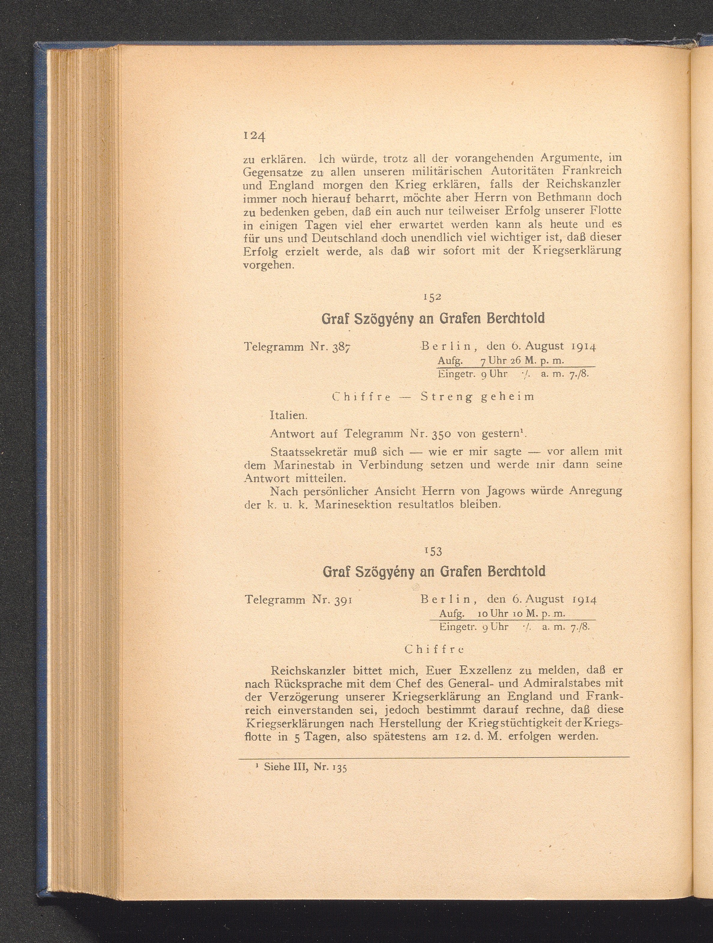 153. Berlin, den 6. August 1914. Graf Szögyény an Grafen Berchtold.