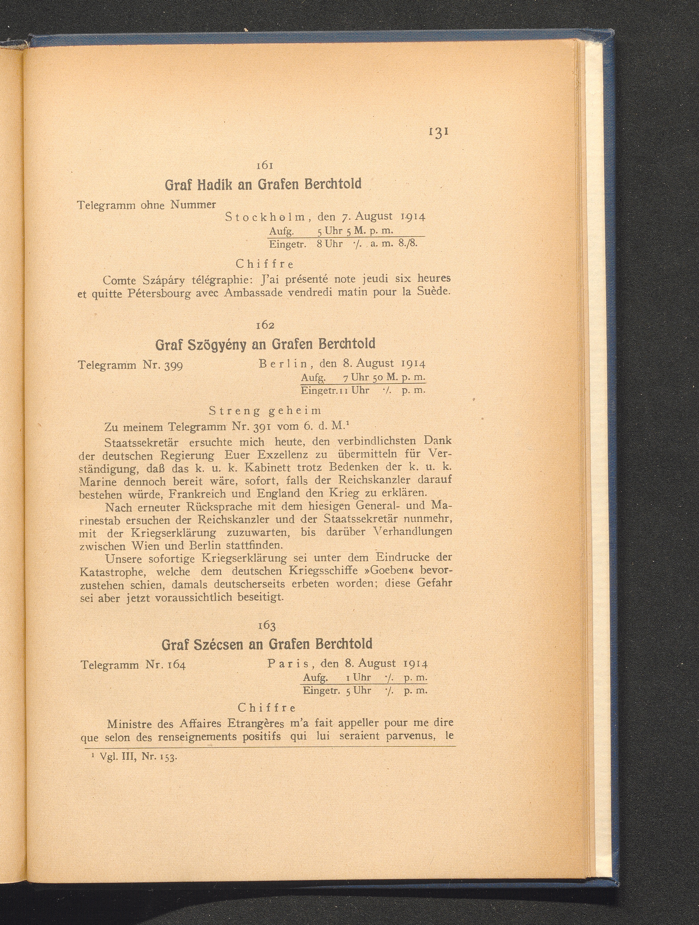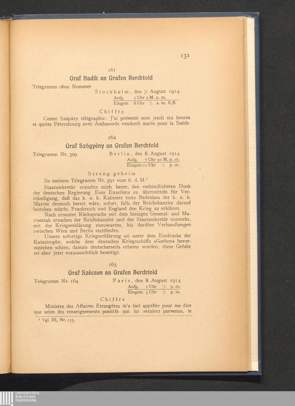 163. Paris, den 8. August 1914. Graf Szécsen an Grafen Berchtold.