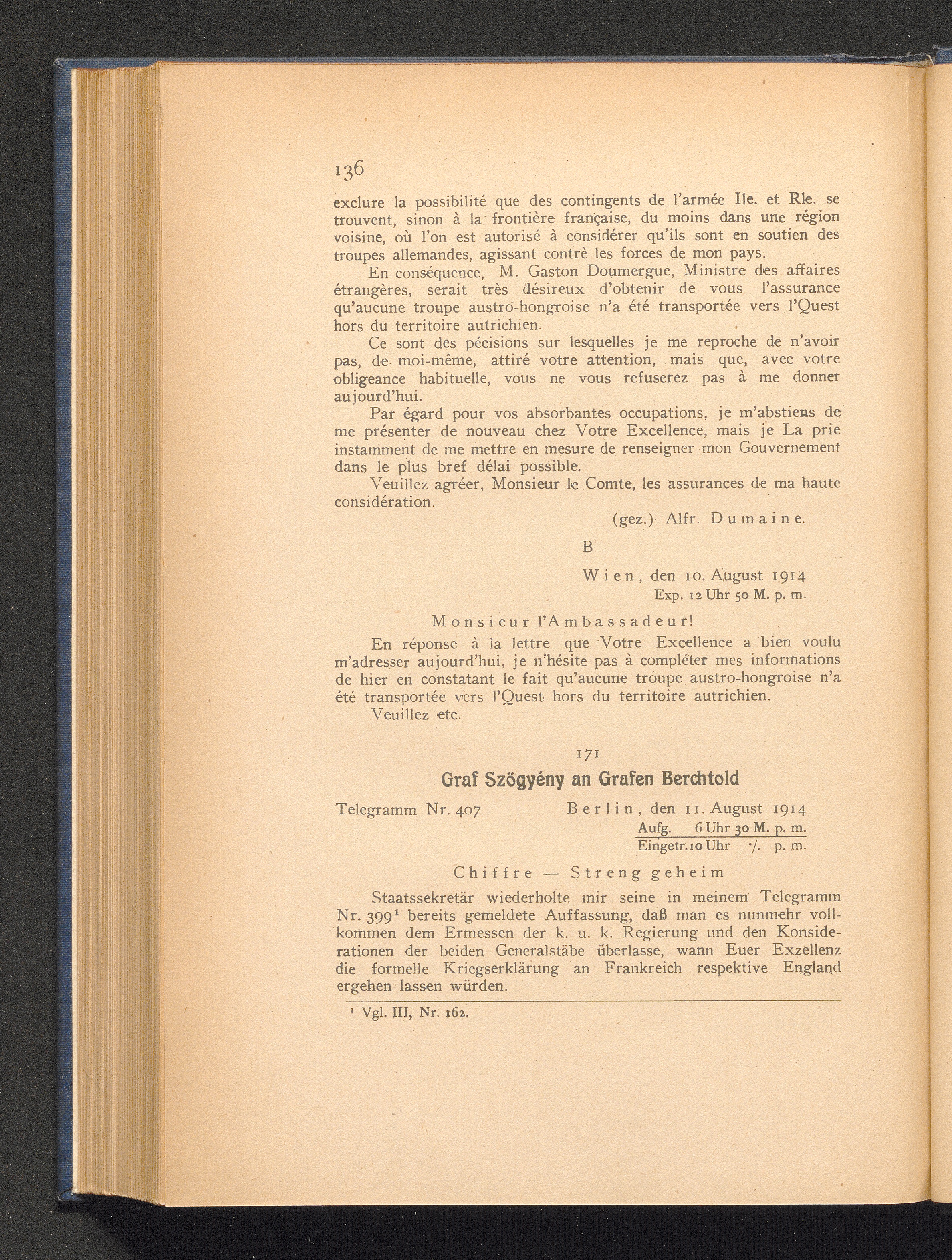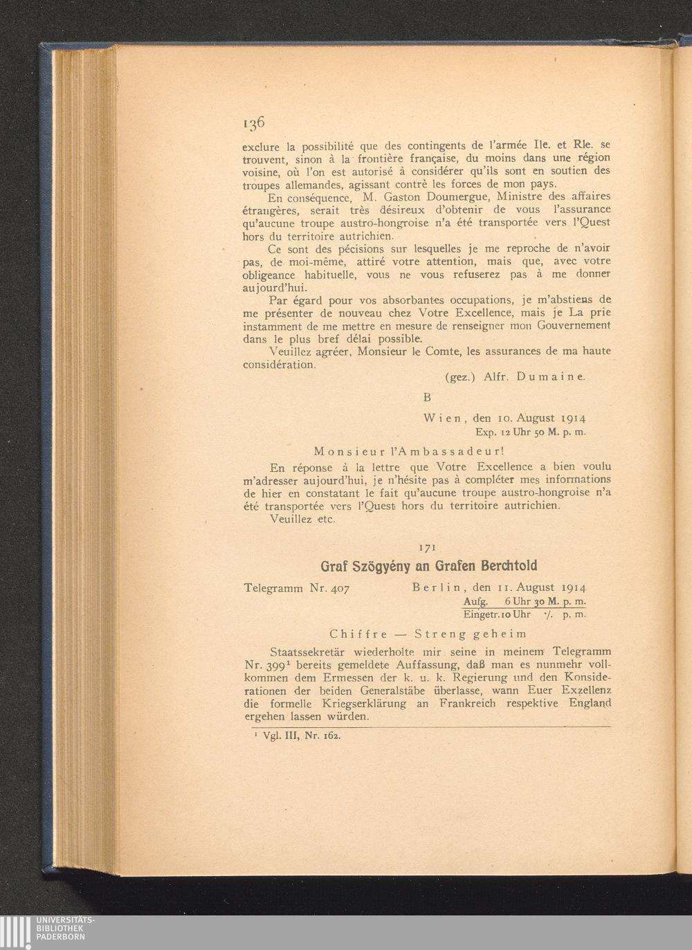 171. Berlin, den 11. August 1914. Graf Szögyény an Grafen Berchtold.