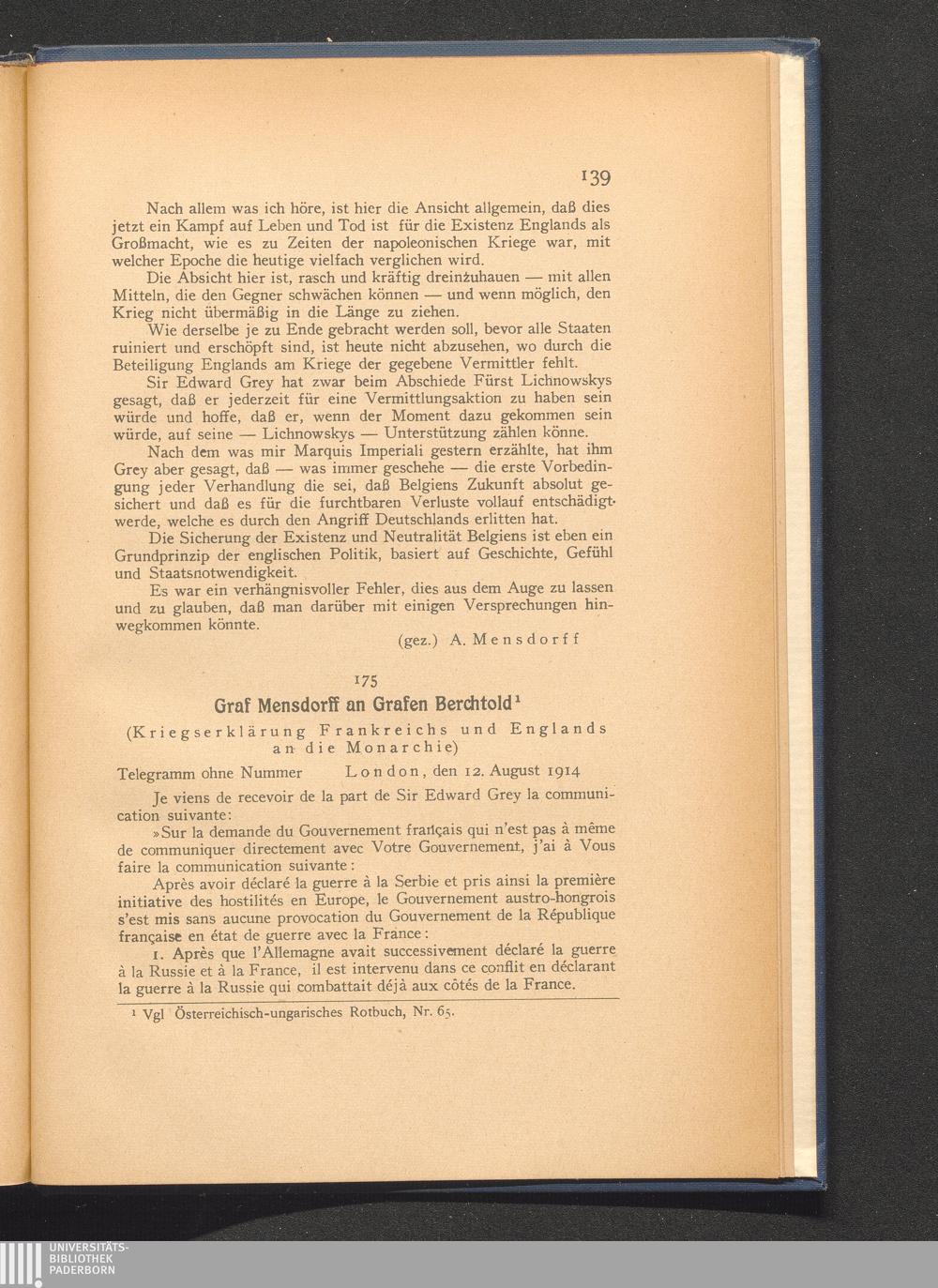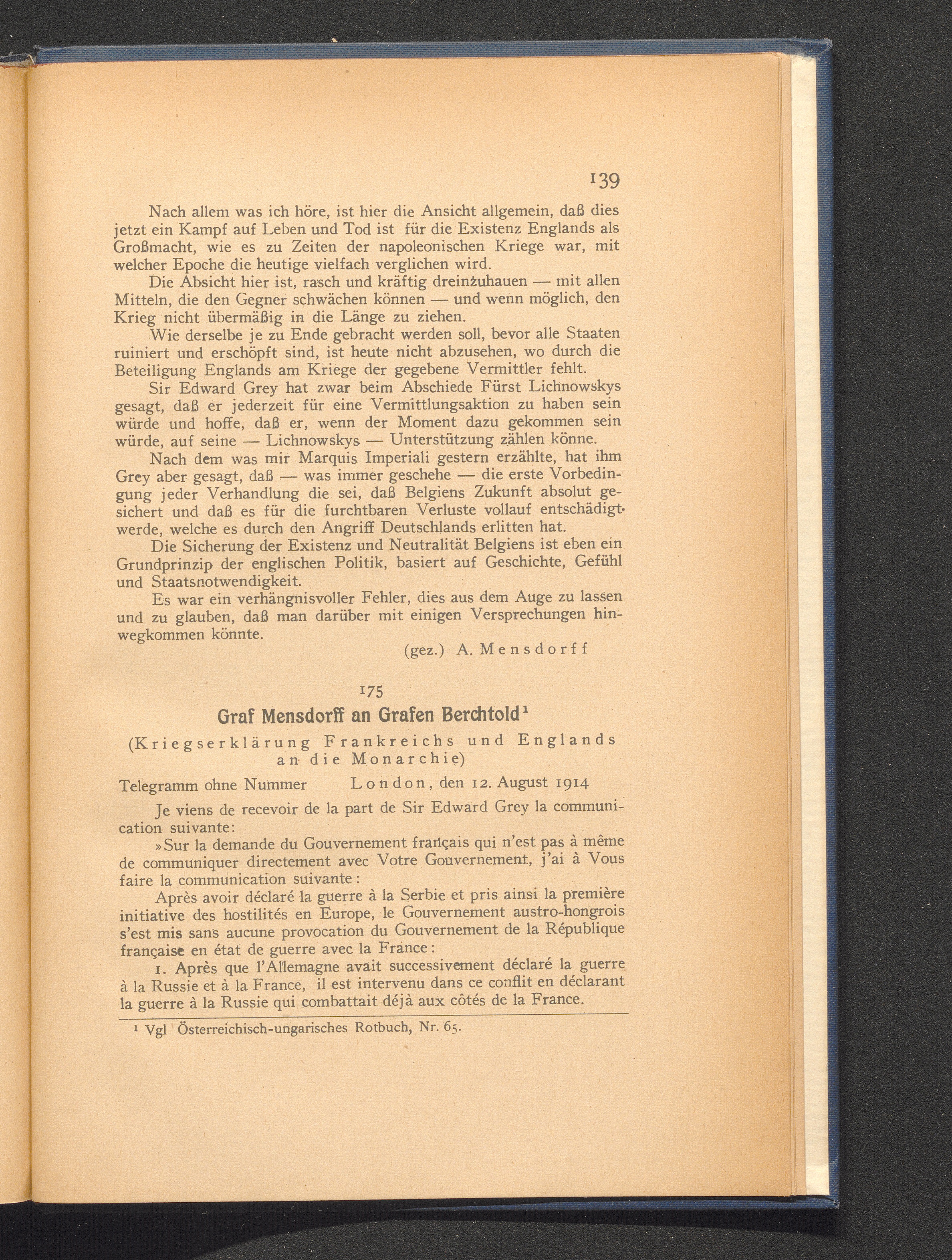 175. London, den 12. August 1914. Graf Mensdorff an Grafen Berchtold.
