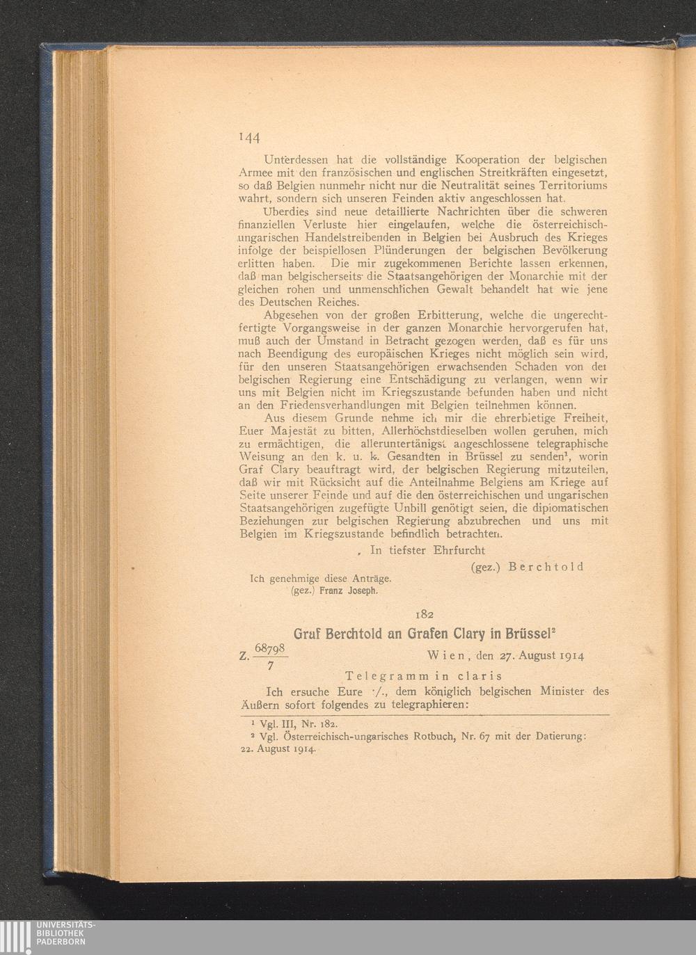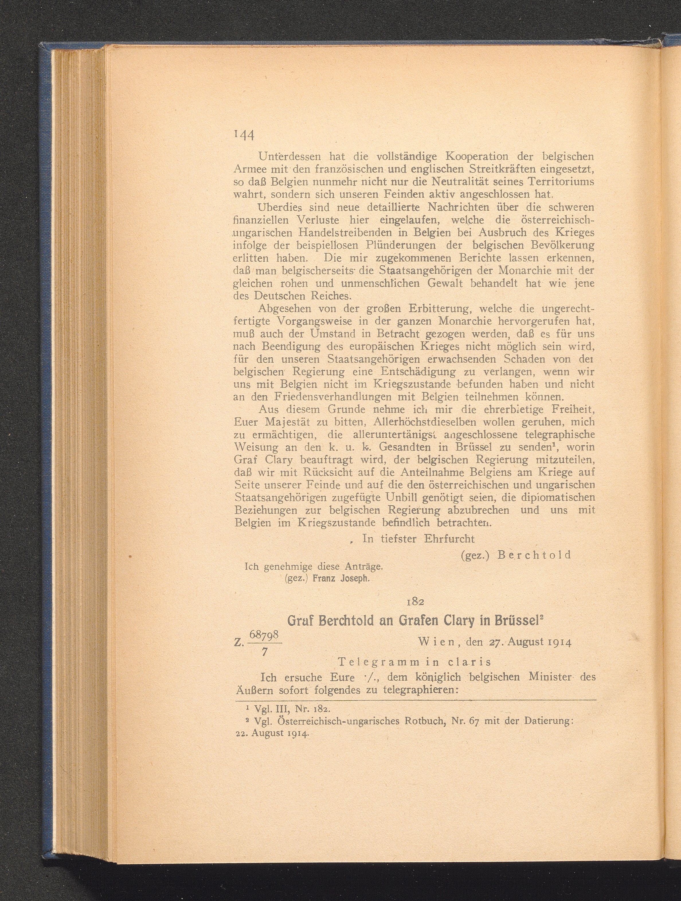 182. Wien, den 27.August 1914. Graf Berchtold an Grafen Clary in Brüssel.