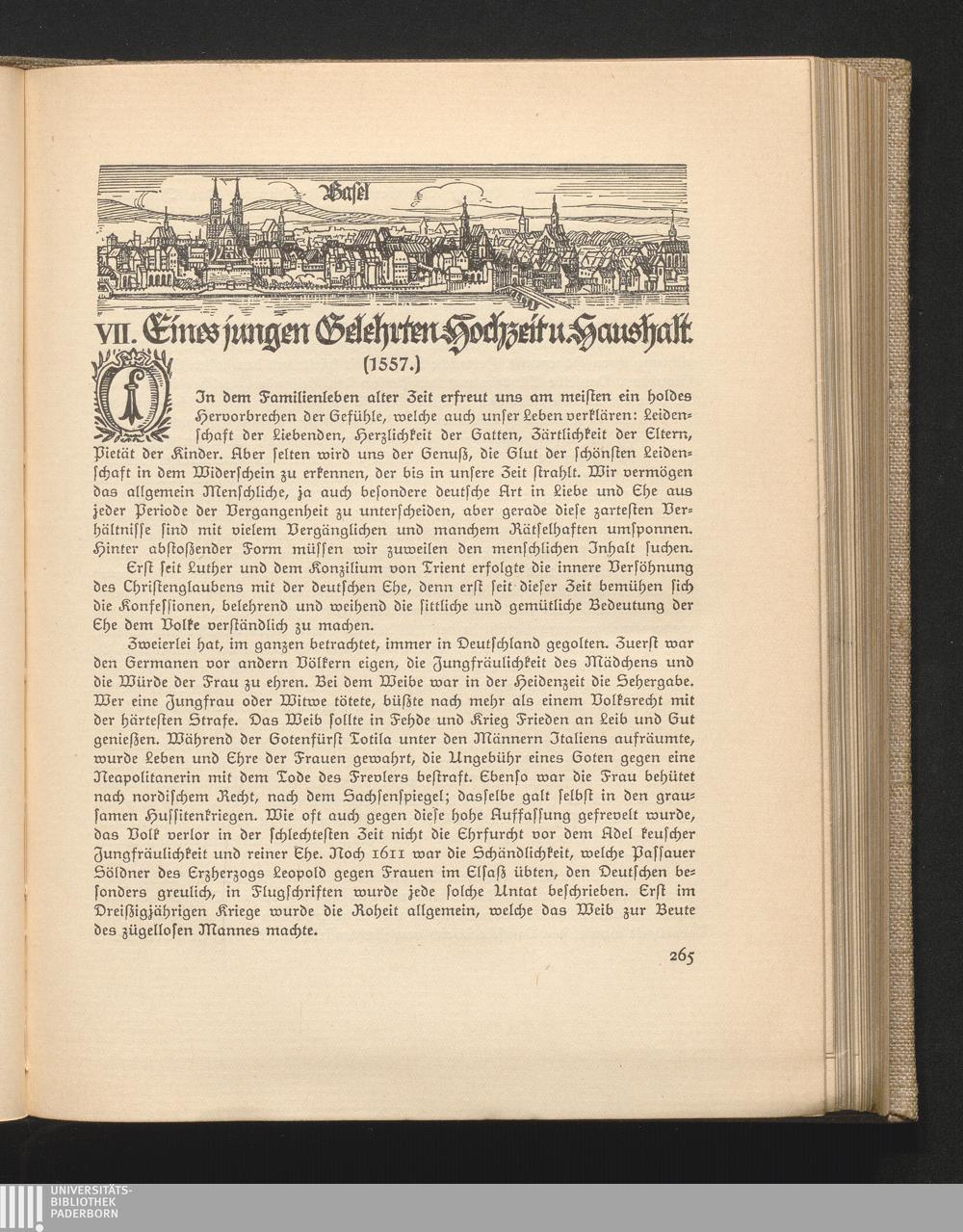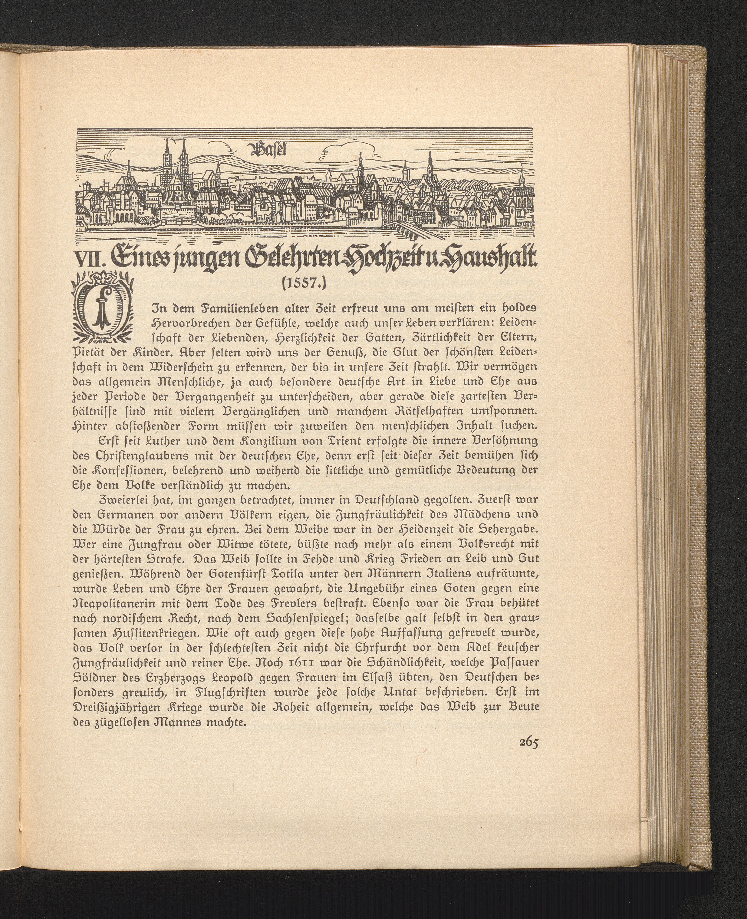 VII. Eines jungen Gelehrten Hochzeit und Haushalt. Das Weib bei den Deutschen, Ehe als Bündnis zweier Familien. Die Trauung. Erzählung des Felix Platter.