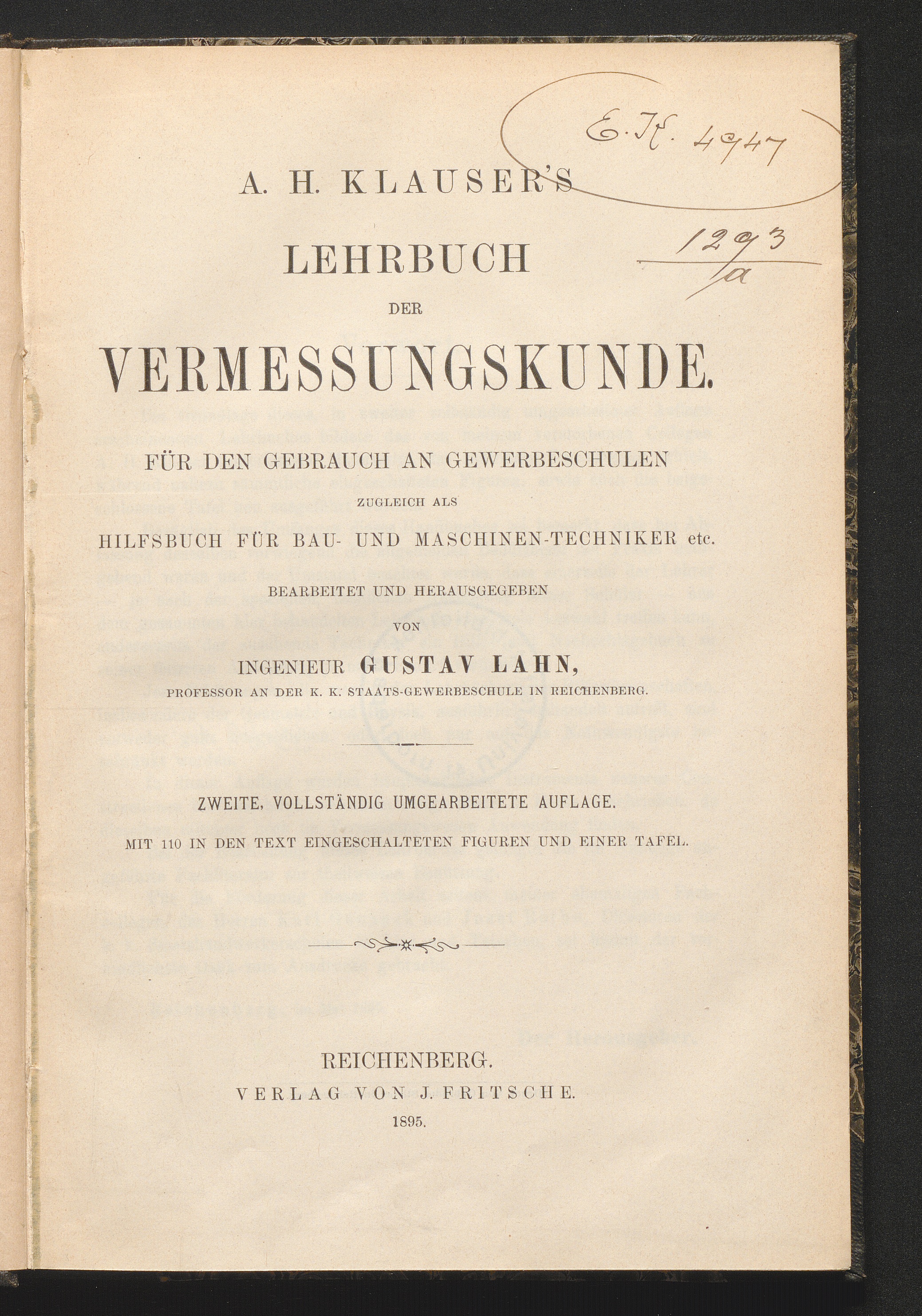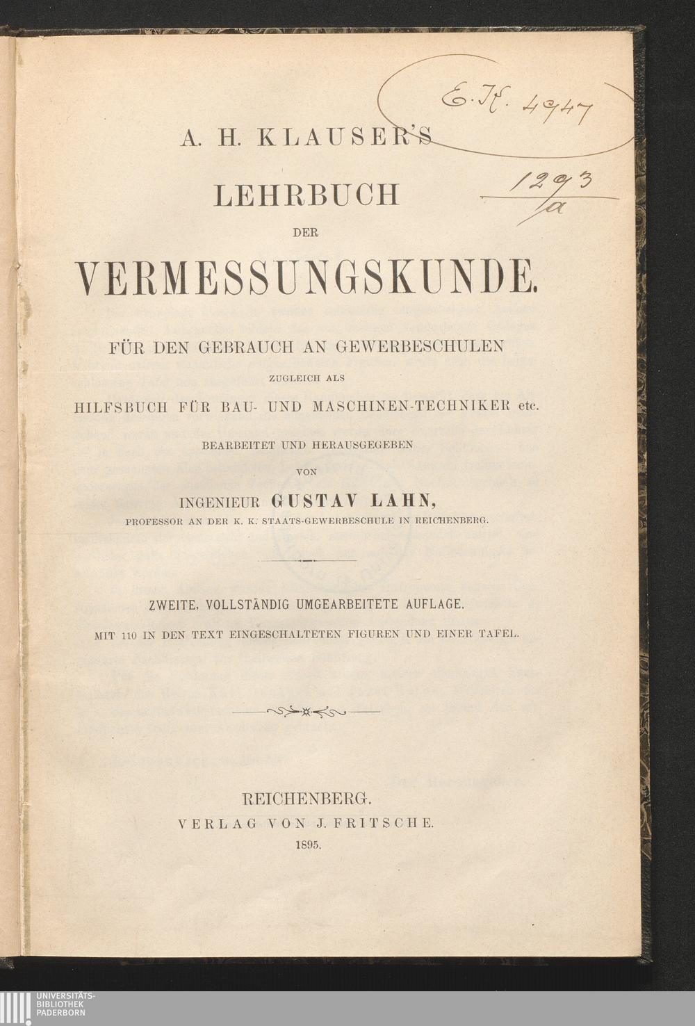 A. H. Klauser's Lehrbuch der Vermessungskunde : für den Gebrauch an Gewerbeschulen zugleich als Hilfsbuch für Bau- und Maschinen-Techniker etc. / bearb. u. hrsg. von Gustav Lahn