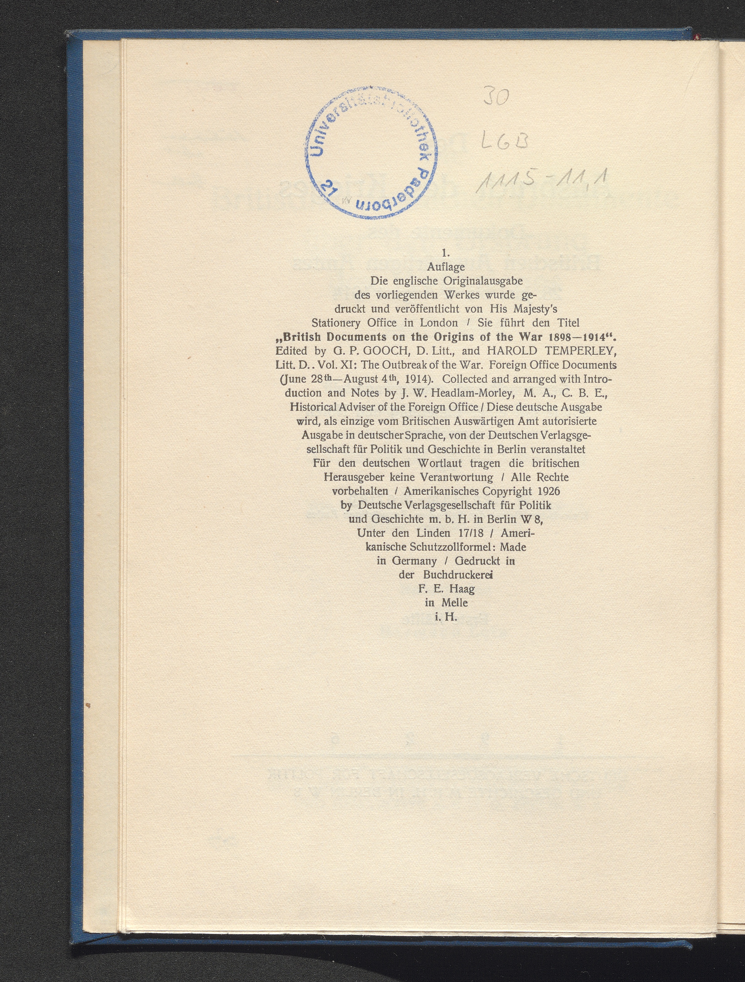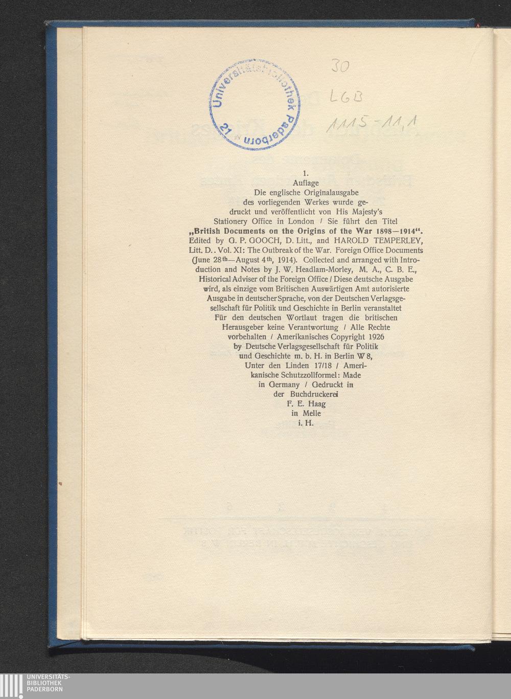 [Bd. 11]. Der Ausbruch des Krieges: Dokumente des Britischen Auswärtigen Amtes, 28. Juni bis 4. August 1914, Hälfte 1 (1926)