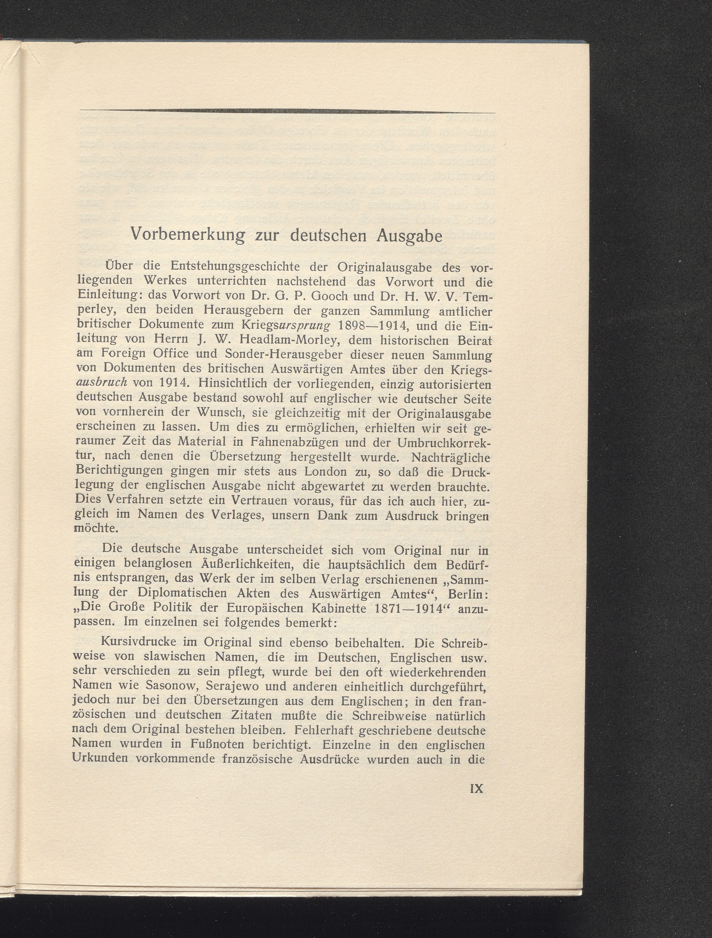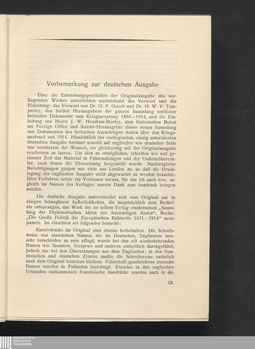 [Bd. 11]. Der Ausbruch des Krieges: Dokumente des Britischen Auswärtigen Amtes, 28. Juni bis 4. August 1914, Hälfte 1 (1926) Ges. und zsgest. sowie mit einer Einl. und Noten vers. von J. W. Headlam-Morley