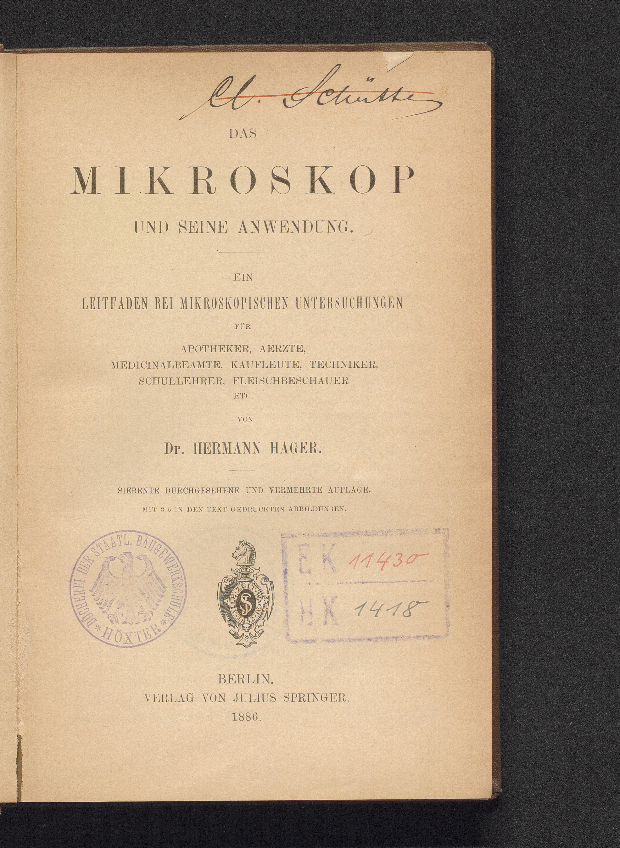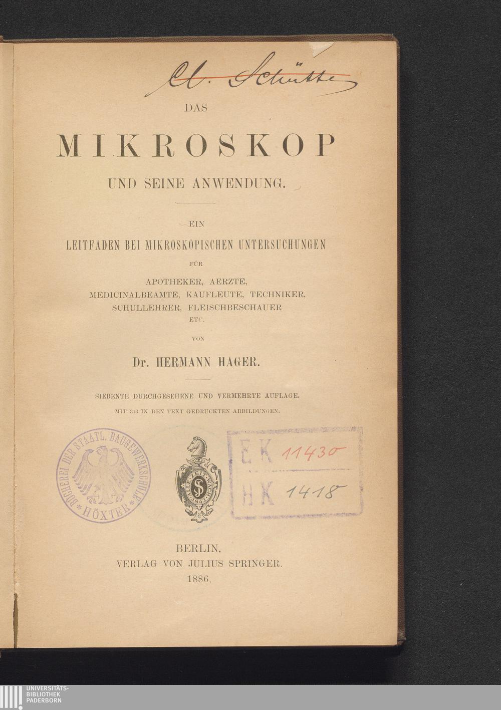 Das Mikroskop und seine Anwendung : ein Leitfaden bei mikroskopischen Untersuchungen für Apotheker, Aerzte, Medicinalbeamte, Kaufleute, Techniker, Schullehrer, Fleischbeschauer etc. / von Hermann Hager
