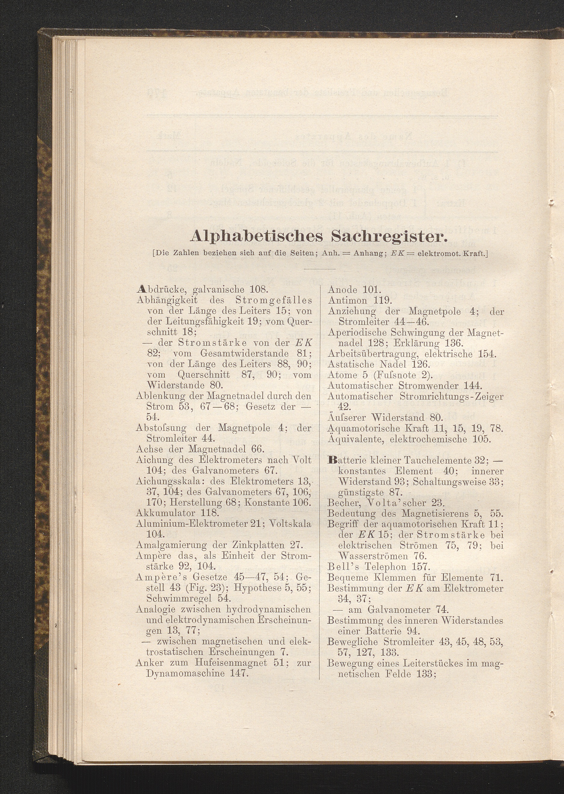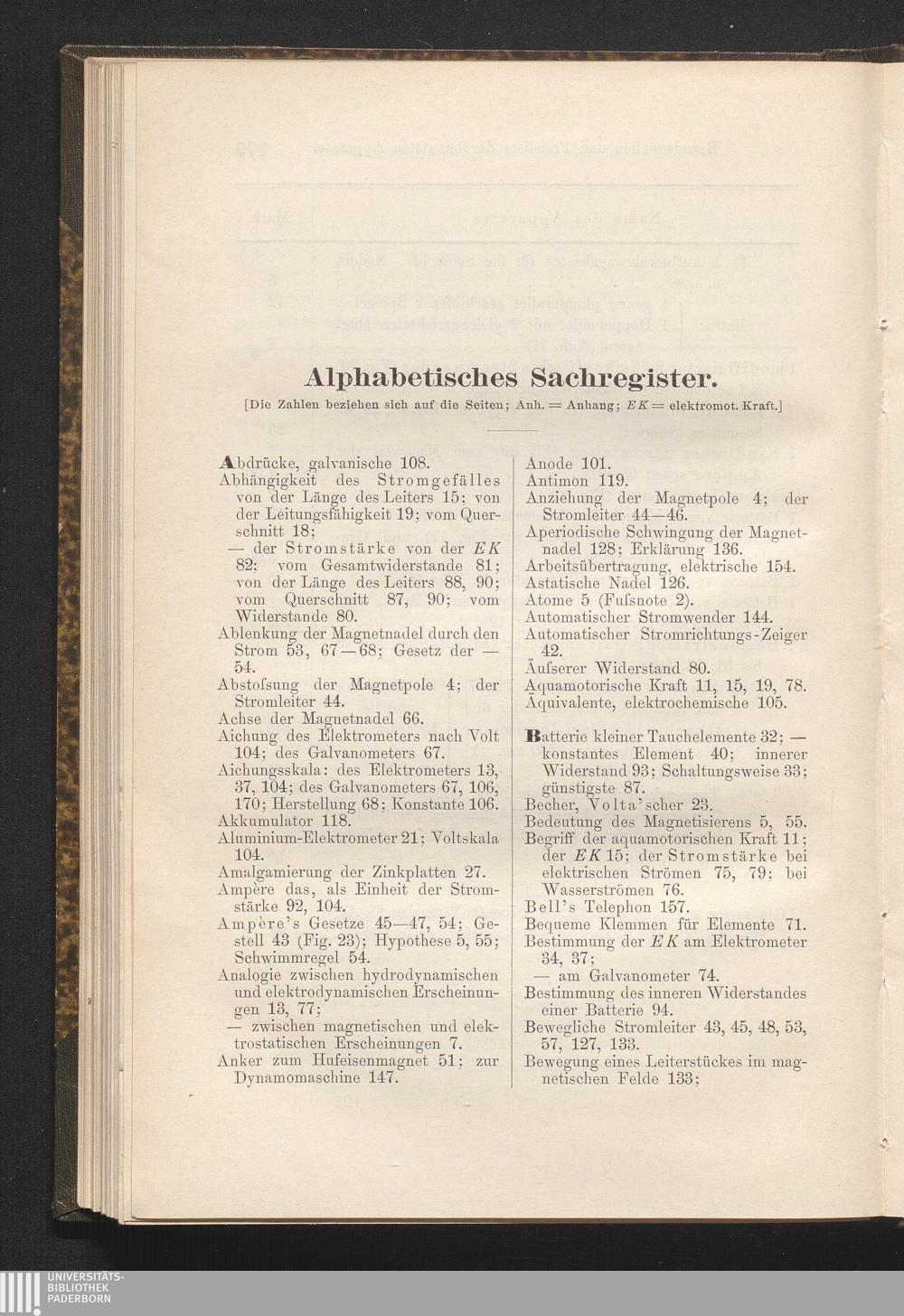 Anhang (Ergänzungen und praktische Winke): 1. Diamagnetismus. - 2. Volta's Gesetz der Spannungsreihe. - 3. Recept für Chromsäurelösung. - 4. Lamettafäden, ihr Ersatz. - 5. Zur Entdeckung der Ablenkung der Magnetnadel durch den galvanischen Strom. - 6. Fleeming's Normaldaniell: Kurzschluss. - 7. Zum Graduieren des Galvanometers. - 8. Zur Erfindung der elektrischen Glühlampe. - 9. Das Demonstrations-Galvanometer als Sinus-Bussole. - 10. Zur Erfindung des magneto-elektrischen Telegraphen. - 11. ...