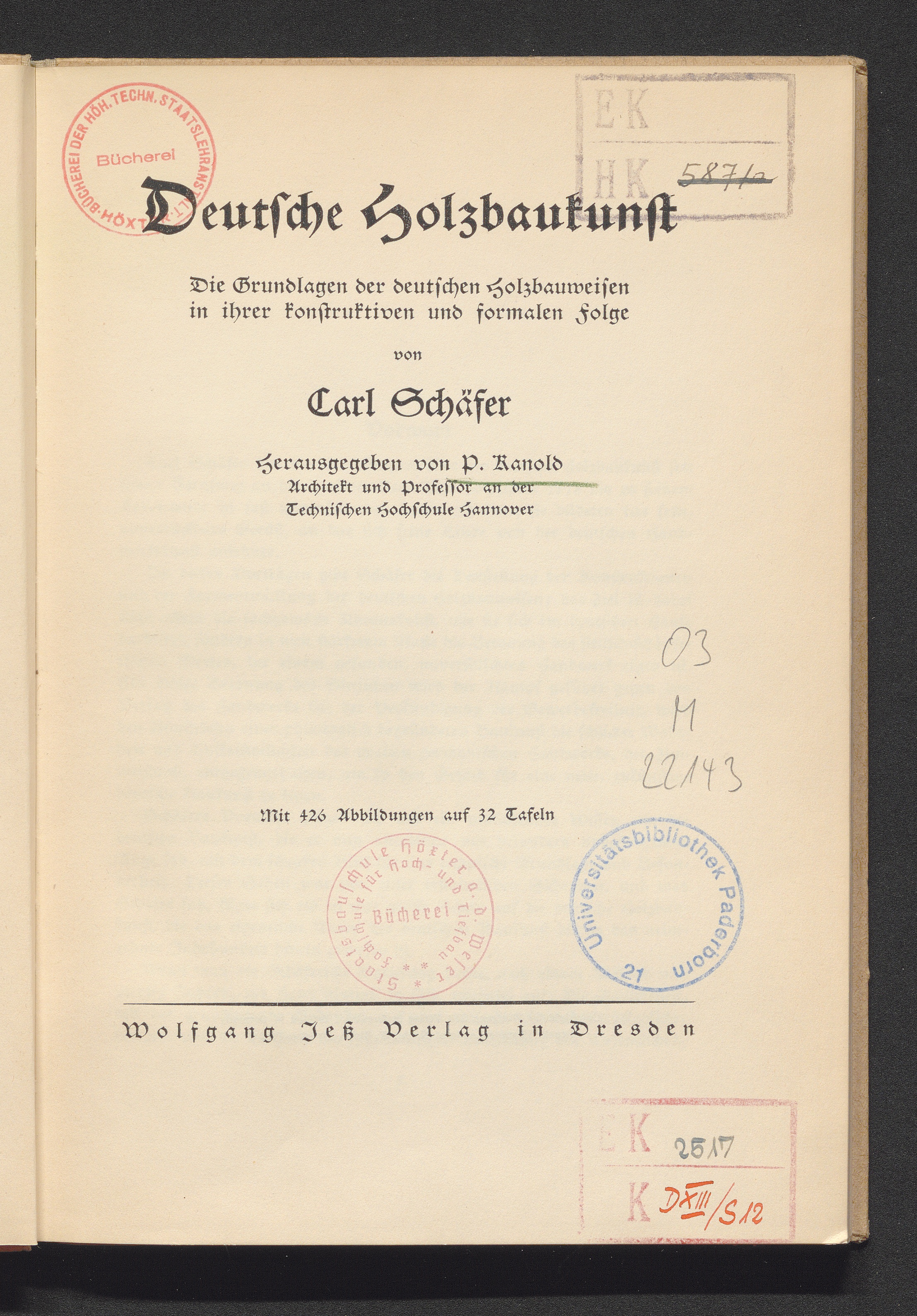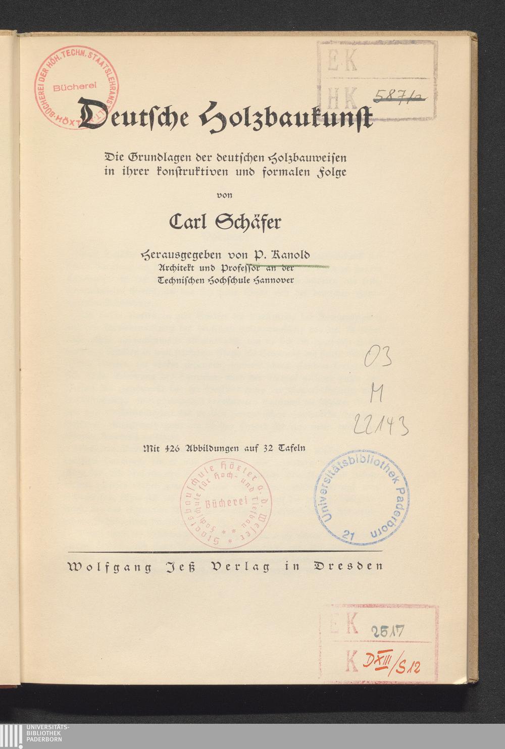 Deutsche Holzbaukunst : die Grundlagen der deutschen Holzbauweisen in ihrer konstruktiven und formalen Folge / von Carl Schäfer. Hrsg. von P. Kanold