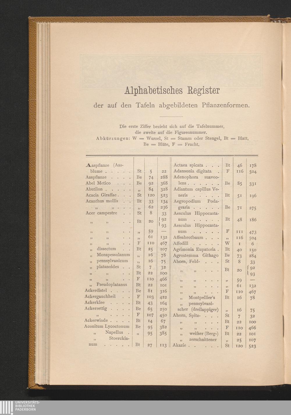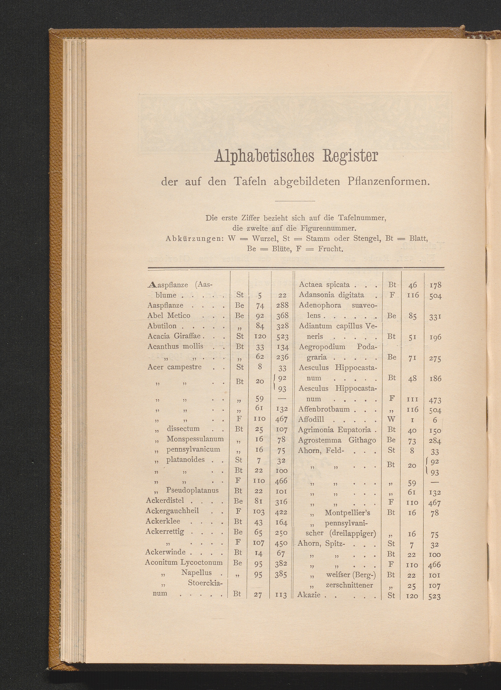 Alphabetisches Register der auf den Tafeln abgebildeten Pflanzenformen.