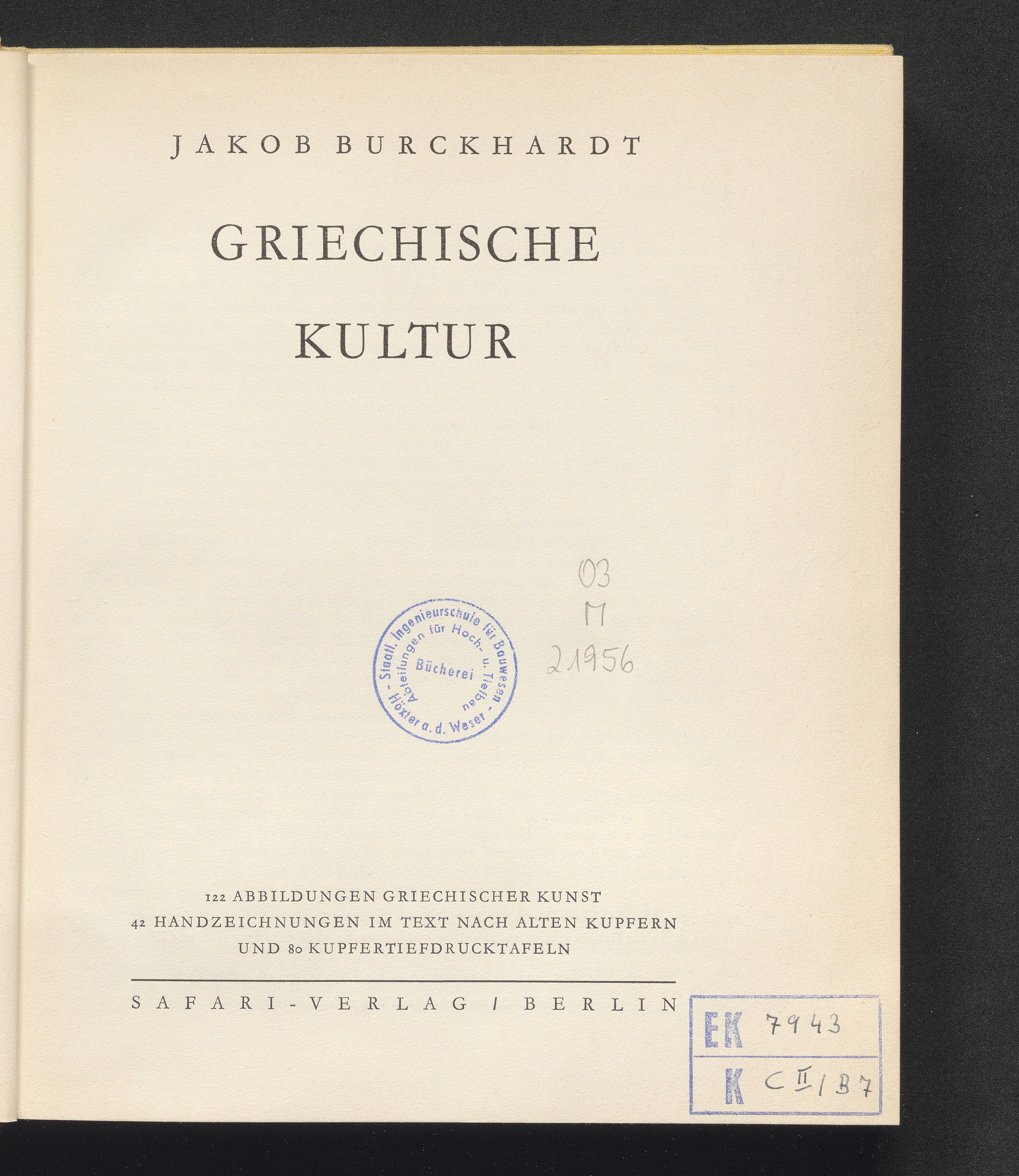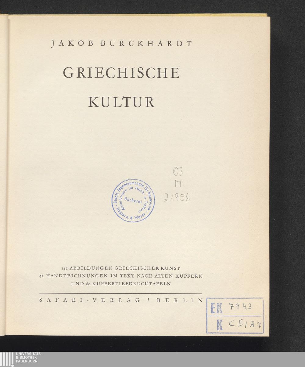 Griechische Kultur / Jakob Burckhardt. [Hrsg. und bearb. von Reinhard Jaspert]