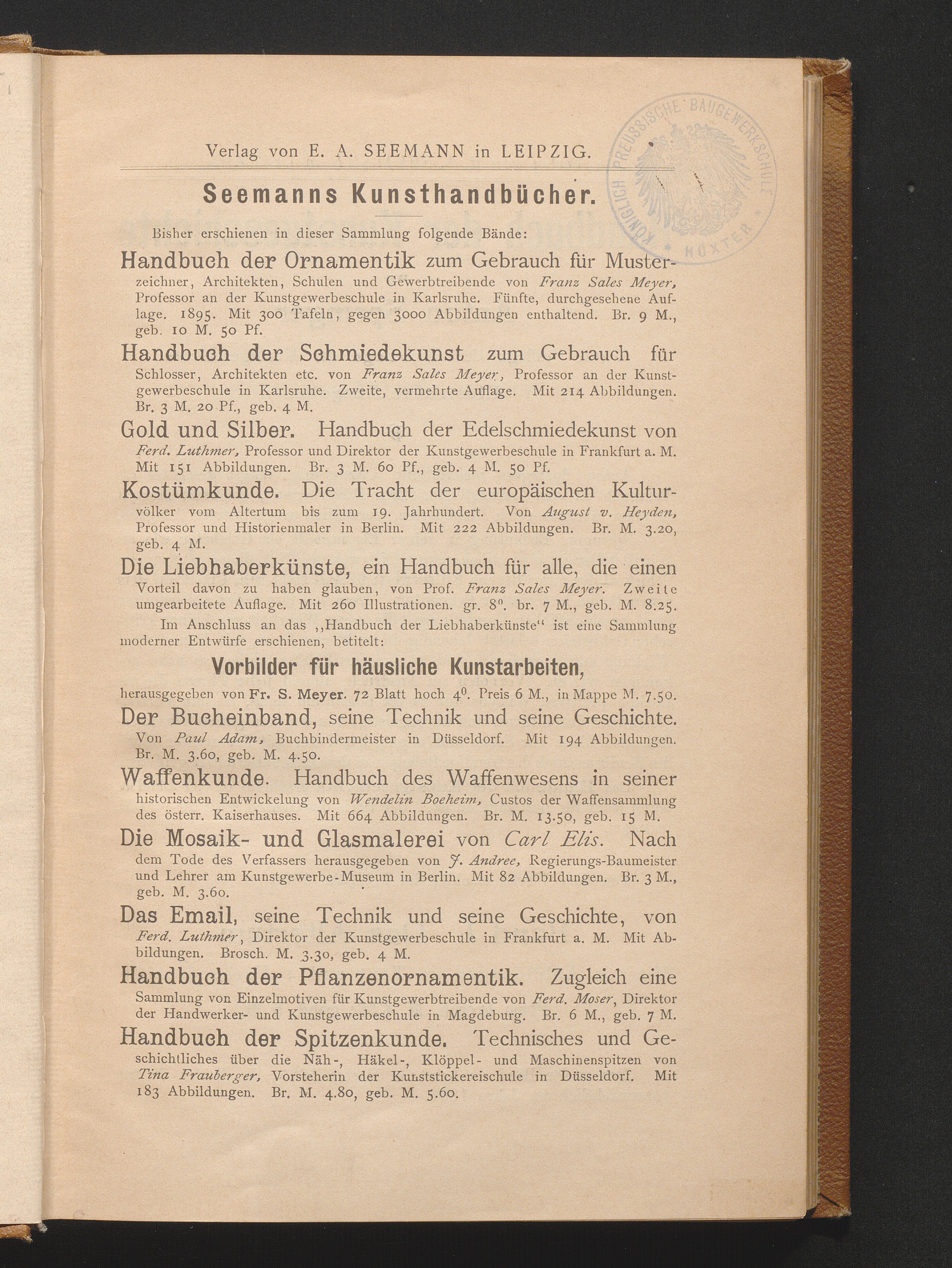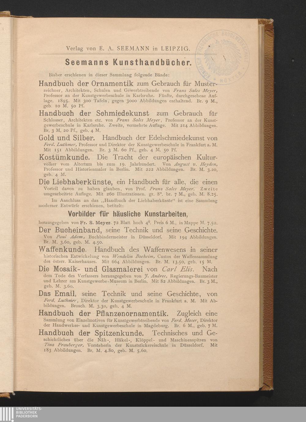 Systematisch geordnetes Handbuch der Ornamentik : zum Gebrauche für Musterzeichner, Architekten, Schulen und Gewerbetreibende sowie zum Studium im allgemeinen / hrsg. von Franz Sales Meyer. Gr. Badische Kunstgewerbeschule in Karlsruhe