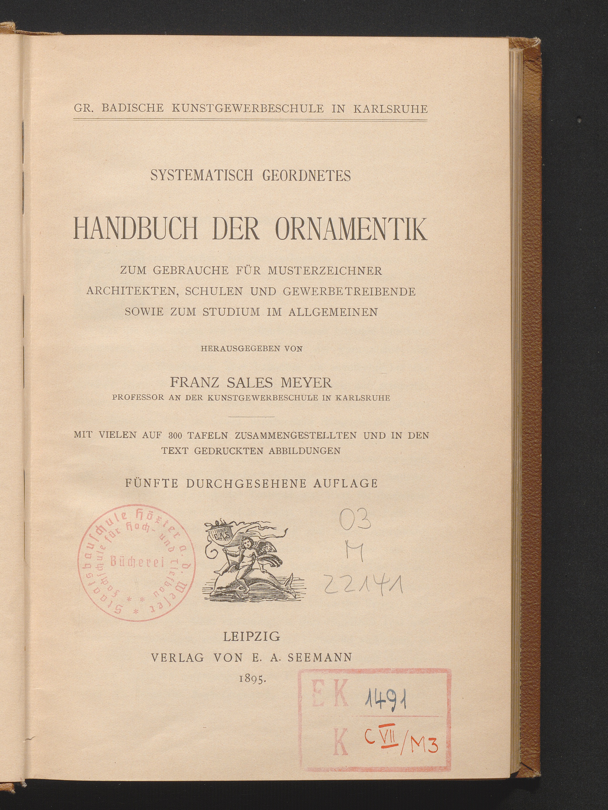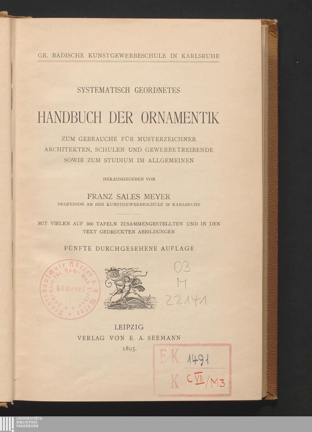 Systematisch geordnetes Handbuch der Ornamentik : zum Gebrauche für Musterzeichner, Architekten, Schulen und Gewerbetreibende sowie zum Studium im allgemeinen / hrsg. von Franz Sales Meyer. Gr. Badische Kunstgewerbeschule in Karlsruhe