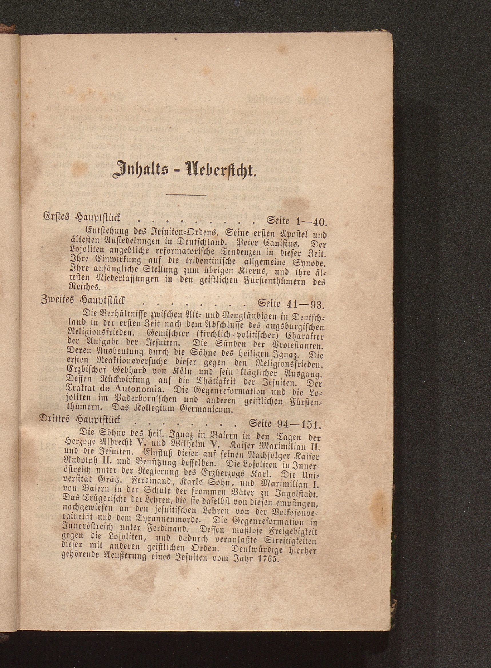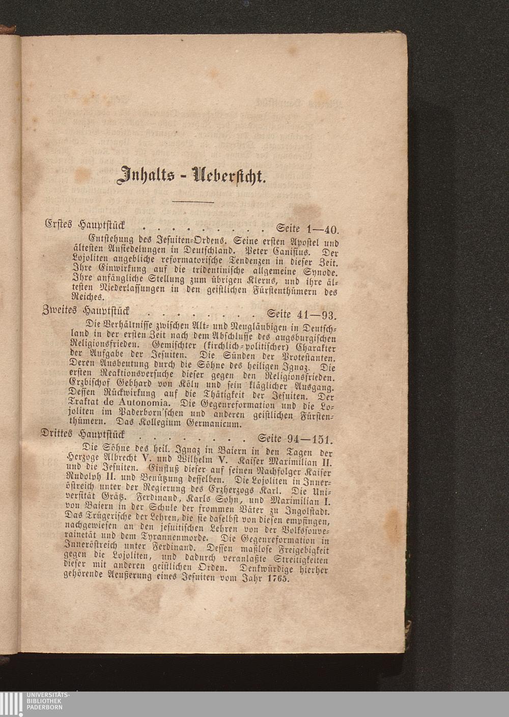 Erstes Hauptstück. Entstehung des Jesuiten-Ordens. Seine ersten Apostel und ältesten Ansiedelungen in Deutschland. Peter Canisius. Der Lojoliten angebliche reformatorische Tendenzen in dieser Zeit. Ihre Einwirkung auf die tridentinische allgemeine Synode. Ihre anfängliche Stellung zum übrigen Klerus, und ihre ältesten Niederlassungen in den geistlichen Fürstenthümern des Reiches.