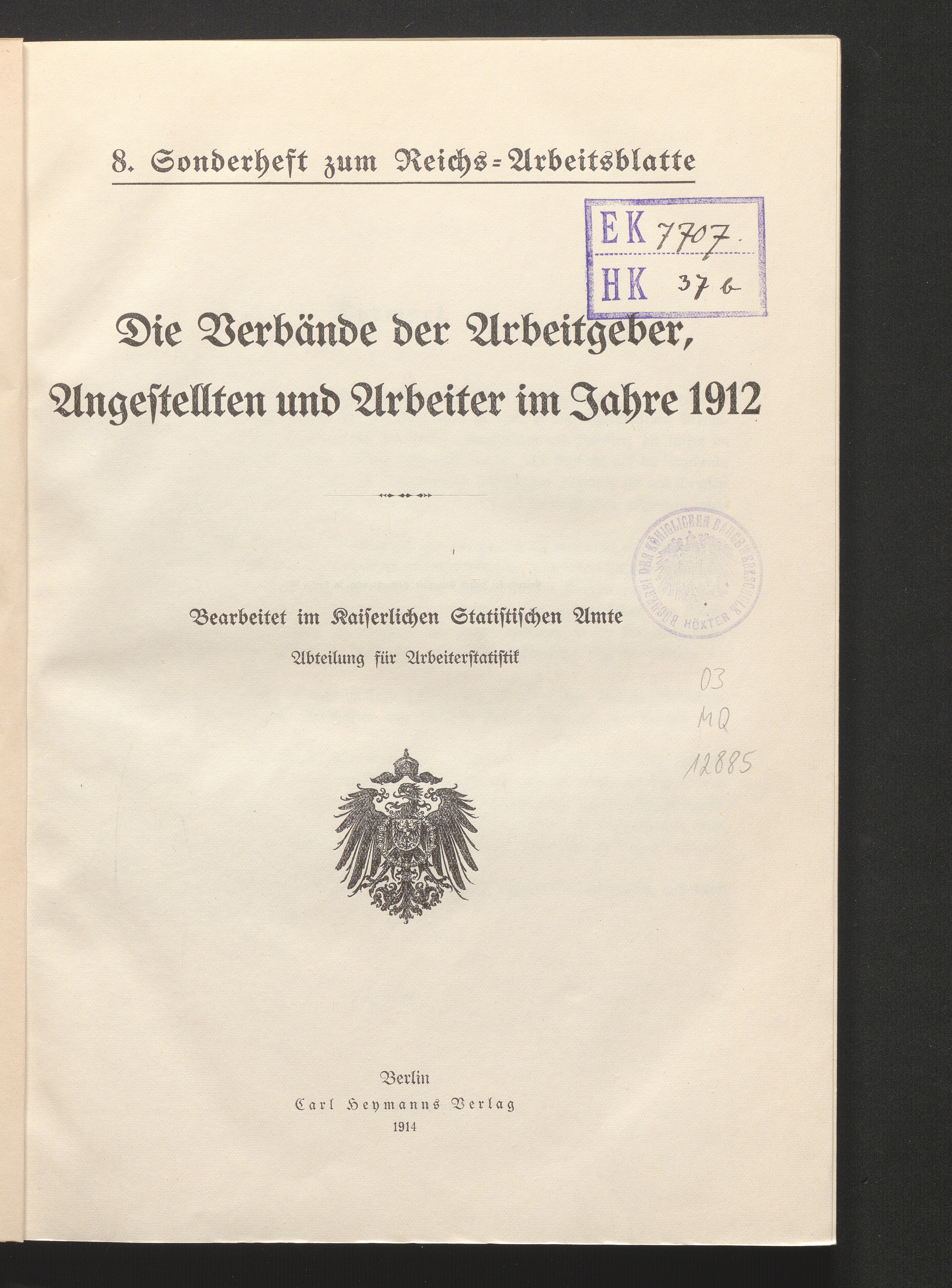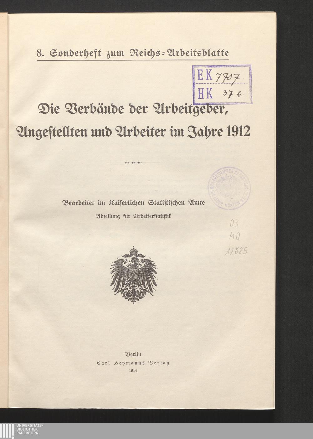 Die Verbände der Arbeitgeber, Angestellten und Arbeiter im Jahre 1912 / bearb. im Kaiserl. Statist. Amte, Abt. für Arbeiterstatistik