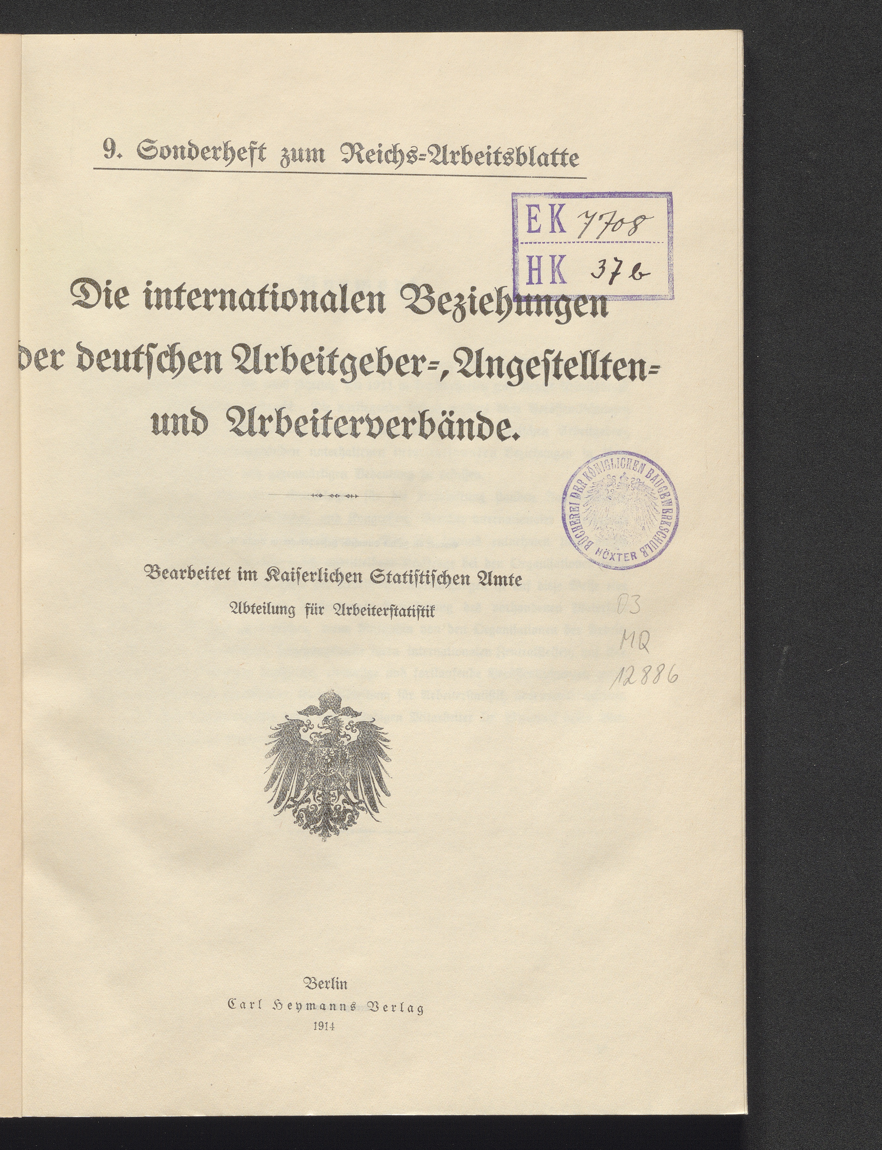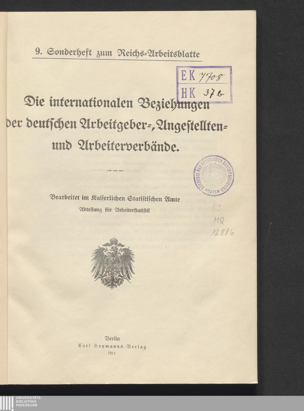 Die internationalen Beziehungen der deutschen Arbeitgeber-, Angestellten- und Arbeiterverbände / bearb. im Kaiserl. Statist. Amte, Abt. für Arbeiterstatistik
