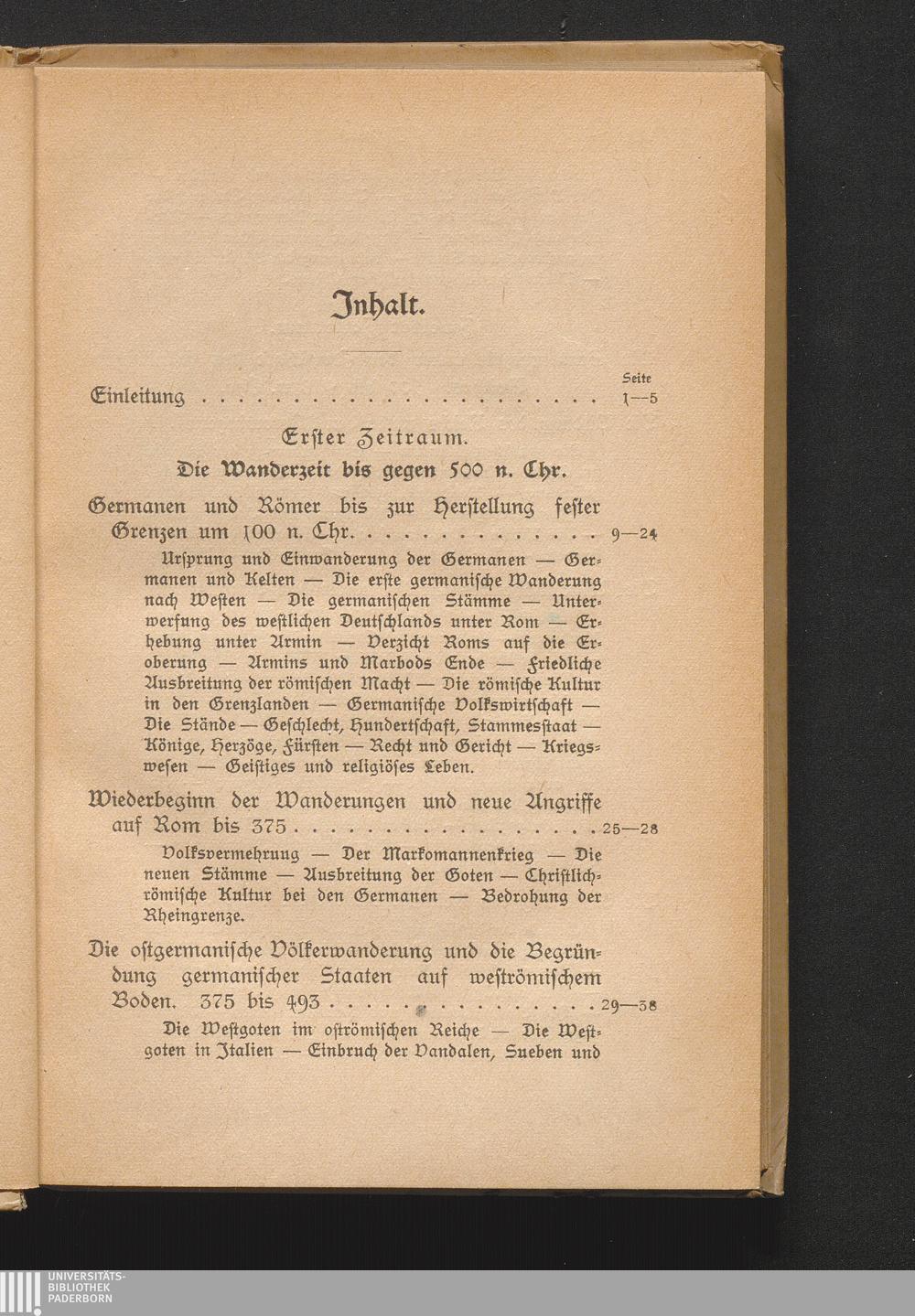 Germanen und Römer bis zur Herstellung fester Grenzen um 100 n. Chr. Ursprung und Einwanderung der Germanen - Germen und Kelten - Die erste germanische Wanderung nach Westen - Die germanischen Stämme - Unterwerfung des westlichen Deutschlands unter Rom - Erhebung unter Armin - Verzicht Roms auf die Eroberung - Armins und Marbods Ende - Friedliche Ausbreitung der römischen Macht - Die römische Kultur in den Grenzlanden - Germanische Volkswirtschaft - Die Stände - Geschlecht, Hundertschaft, Stammesstaat(...)