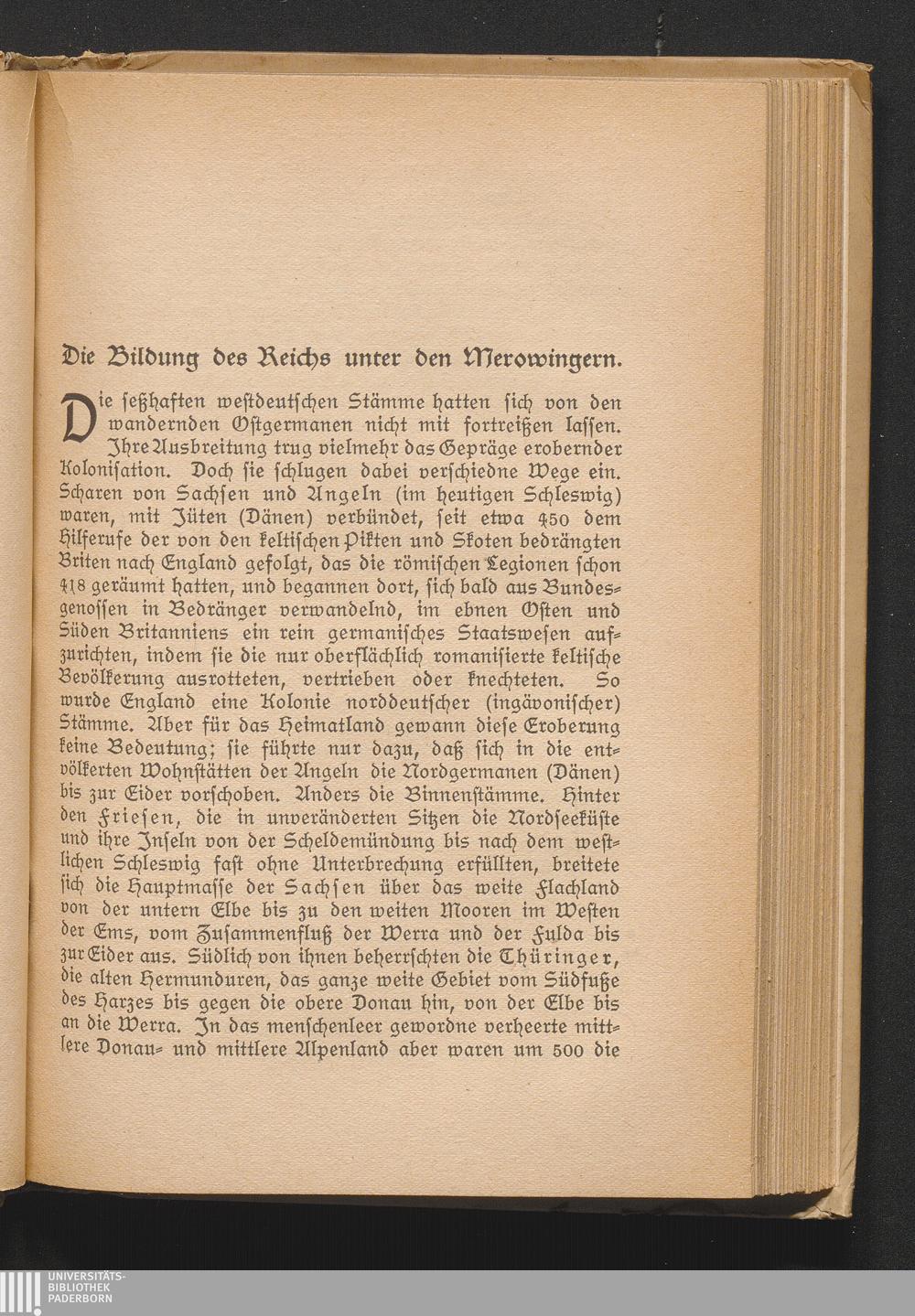 Die Bildung des Reichs unter den Merowingern. Die deutschen Stämme - Einwanderungen der Slawen im Osten - Stammesunterschiede - Chlodwigs Reichsgründung - Reichteilungen und weitere Eroberungen - Jnnere Gegensätze - Königtum und Volksgemeinde - Die Kirche - Volkswirtschaft - Abnahme der Bauernfreiheit - Der neue Adel - Ergebnisse - Bildung.