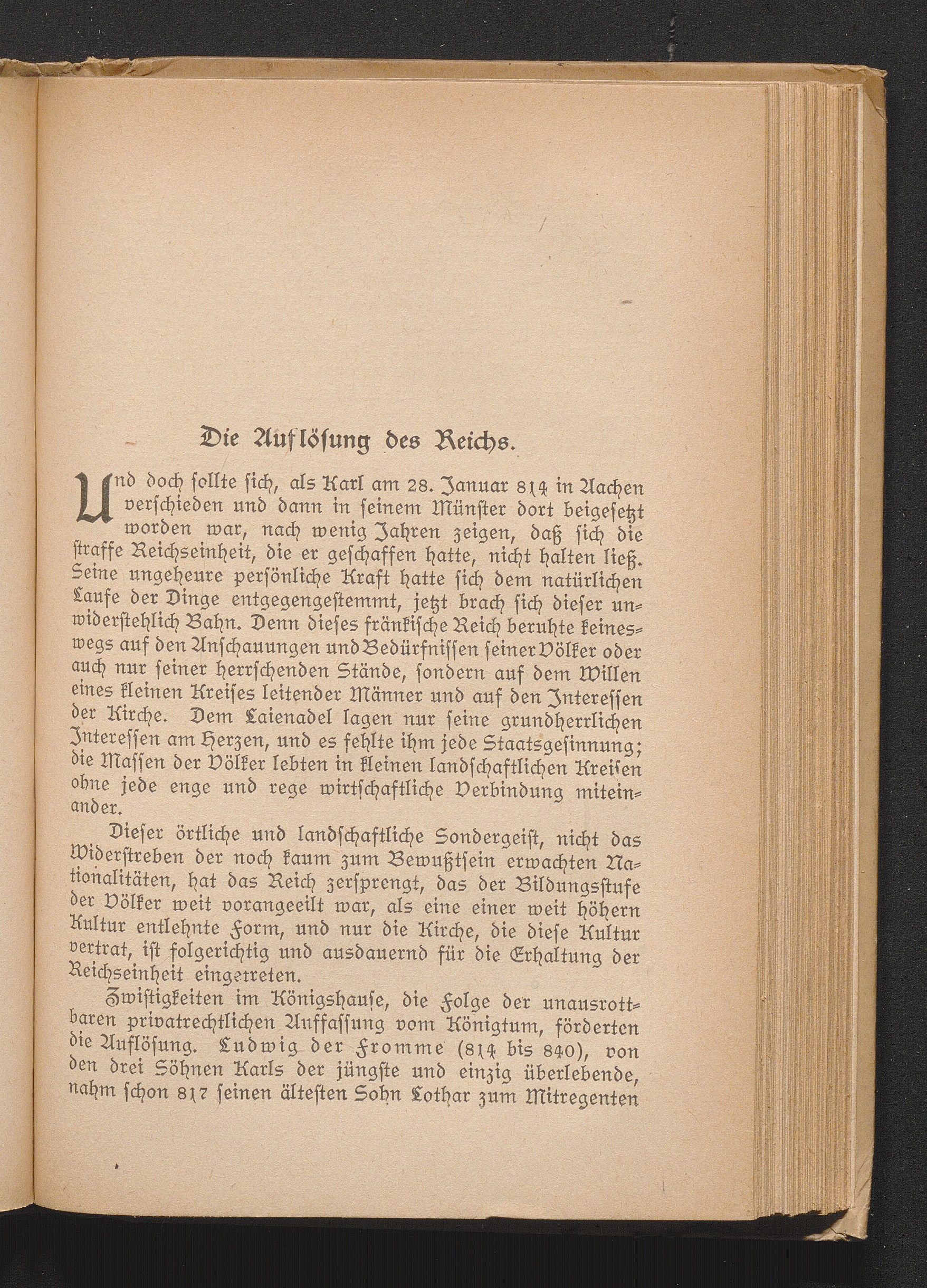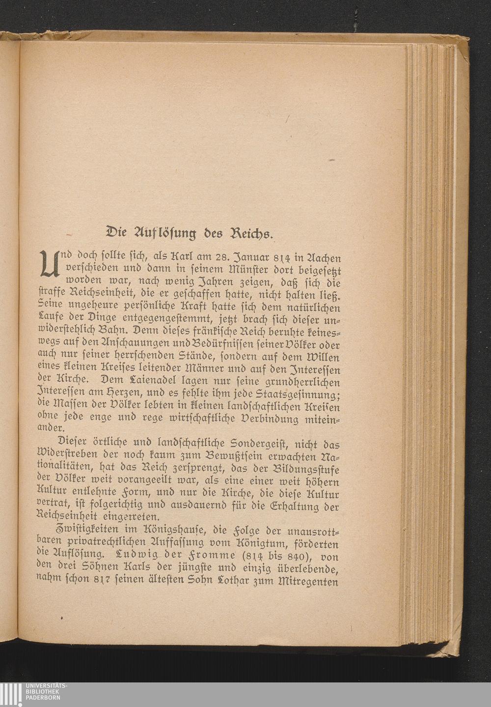 Die Auflösung des Reichs. Gründe der Auflösung - Familienkriege und Teilungen - Die Kriche und ihre Politik - Die burgundischen Reiche - Das ostfränkische Reich unter Ludwig dem Deutschen - Das ostfränkische Reich nach Ludwig dem Deutschen - Die Normannennot und Karl der Dicke - Arnulf gegenüber den Normannen und Magyaren - Die Ungarnnot und die Stammesherzogtümer - Konrad der Erste.