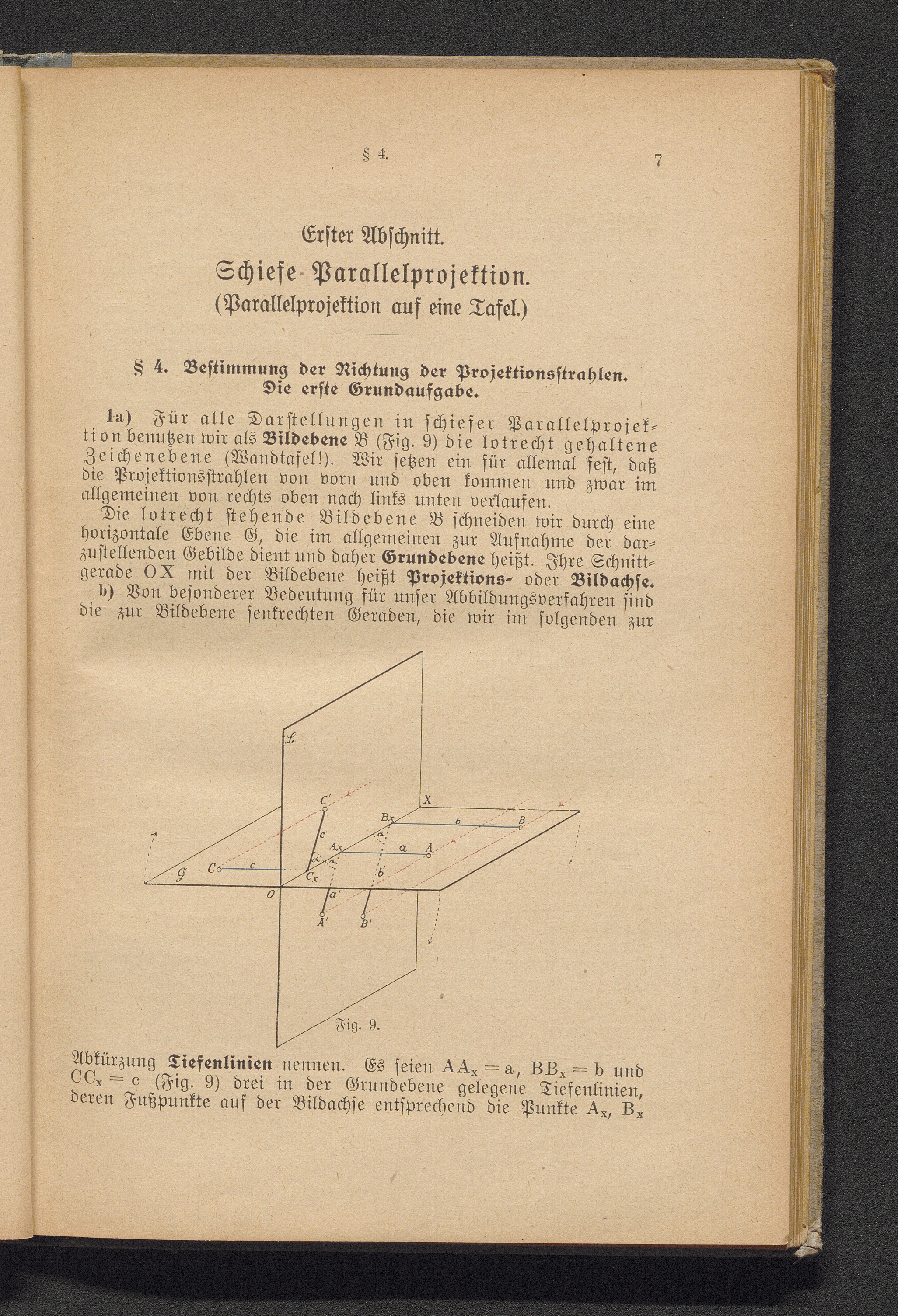 Erster Abschnitt. Die schiefe Parallelprojektion. (Abbildung auf eine Tafel.)