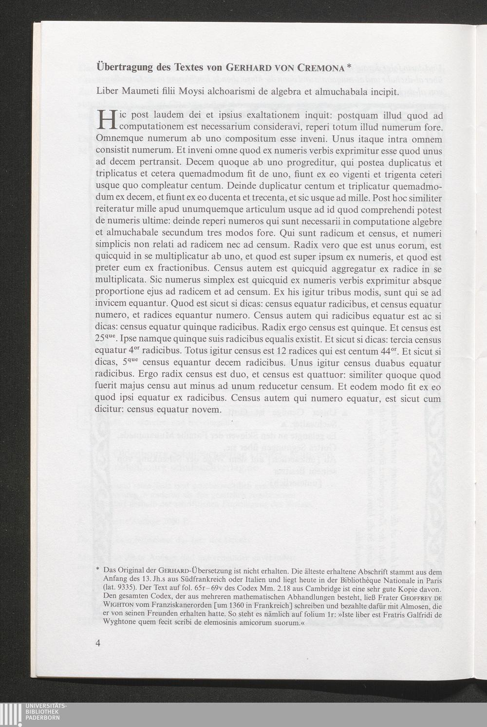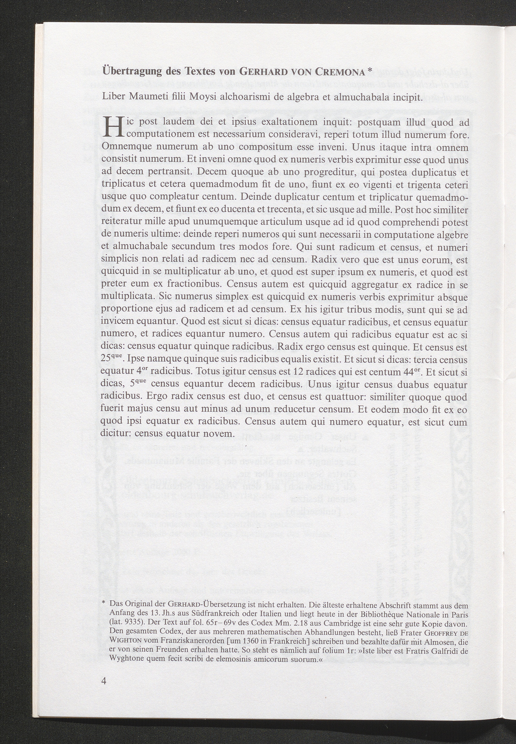 Und darin folgt darauf eine Einführung in das Rechnen, dann das Buch der Korrespondenz über al-dschabr und al-muqabala und dann die hinreichende Einführung in die Grundlagen von al-dschabr und al-muqabala.